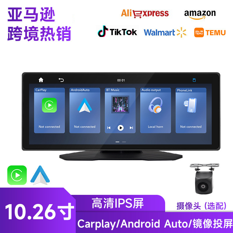 跨境10.26寸车载智慧便携屏无线Carplay安卓AUTO前后记录仪4K汽车