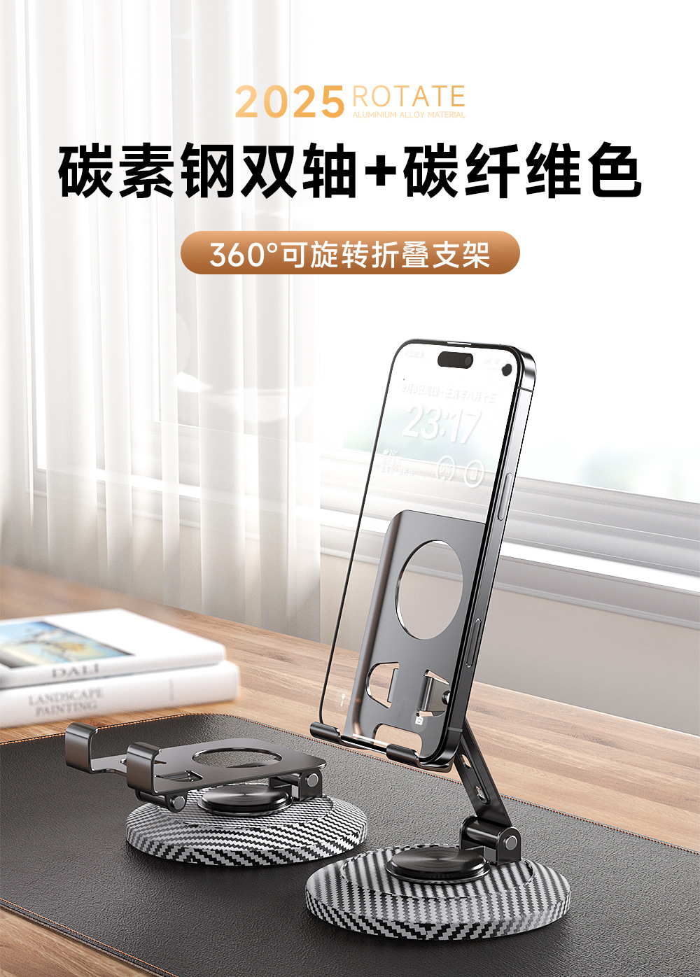 跨境木纹金属旋转折叠桌面手机支架懒人直播平板可升降调节便携款