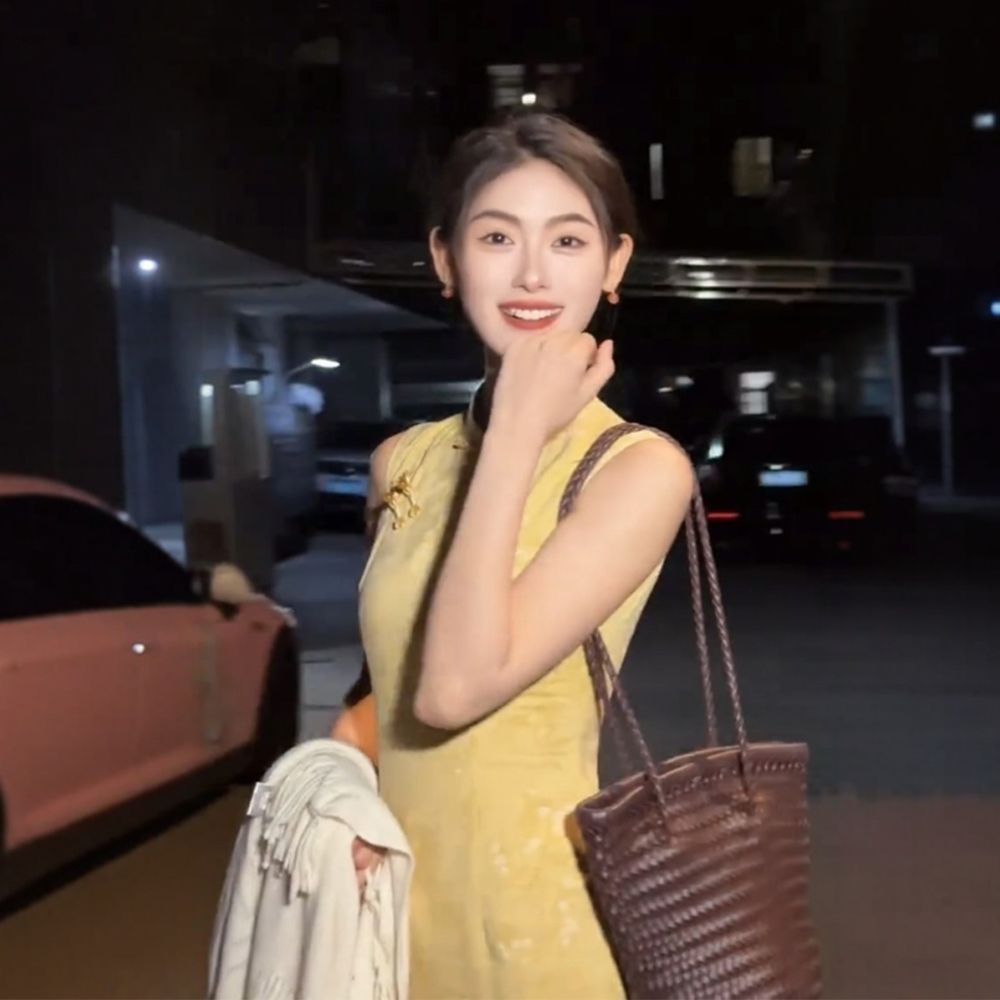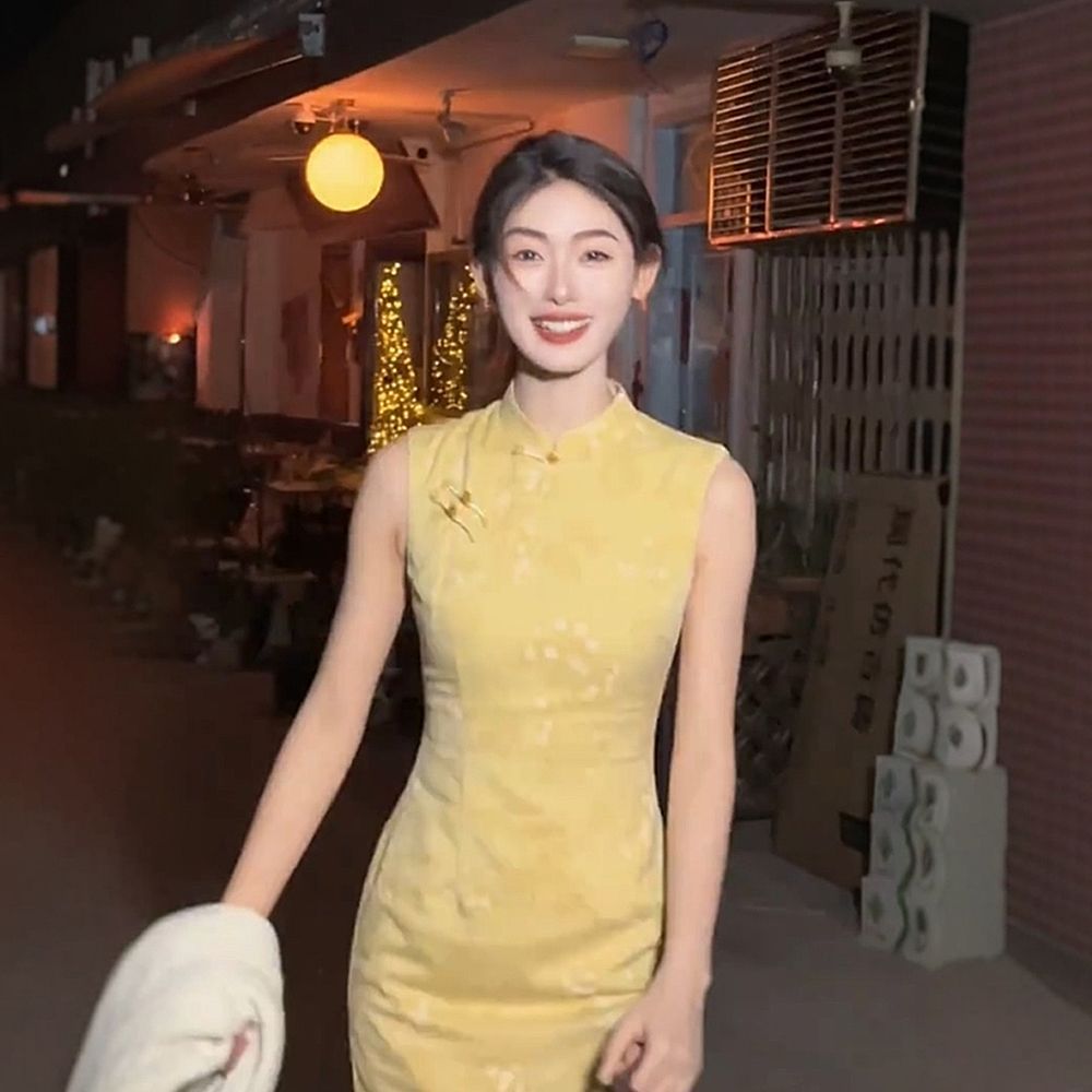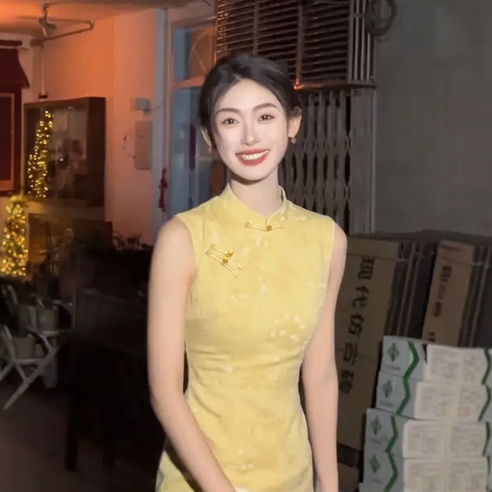 2025年夏新中国式黄色立襟ワンピース気質改良チャイナドレス