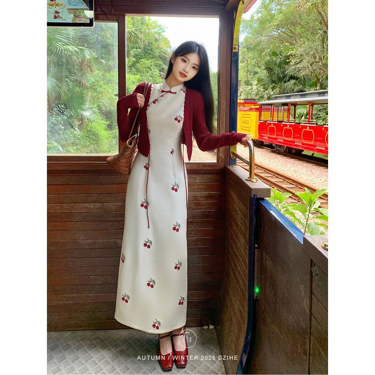 沁樱'新中式樱桃绣花改良旗袍女早秋复古立领掐腰连衣裙两件套