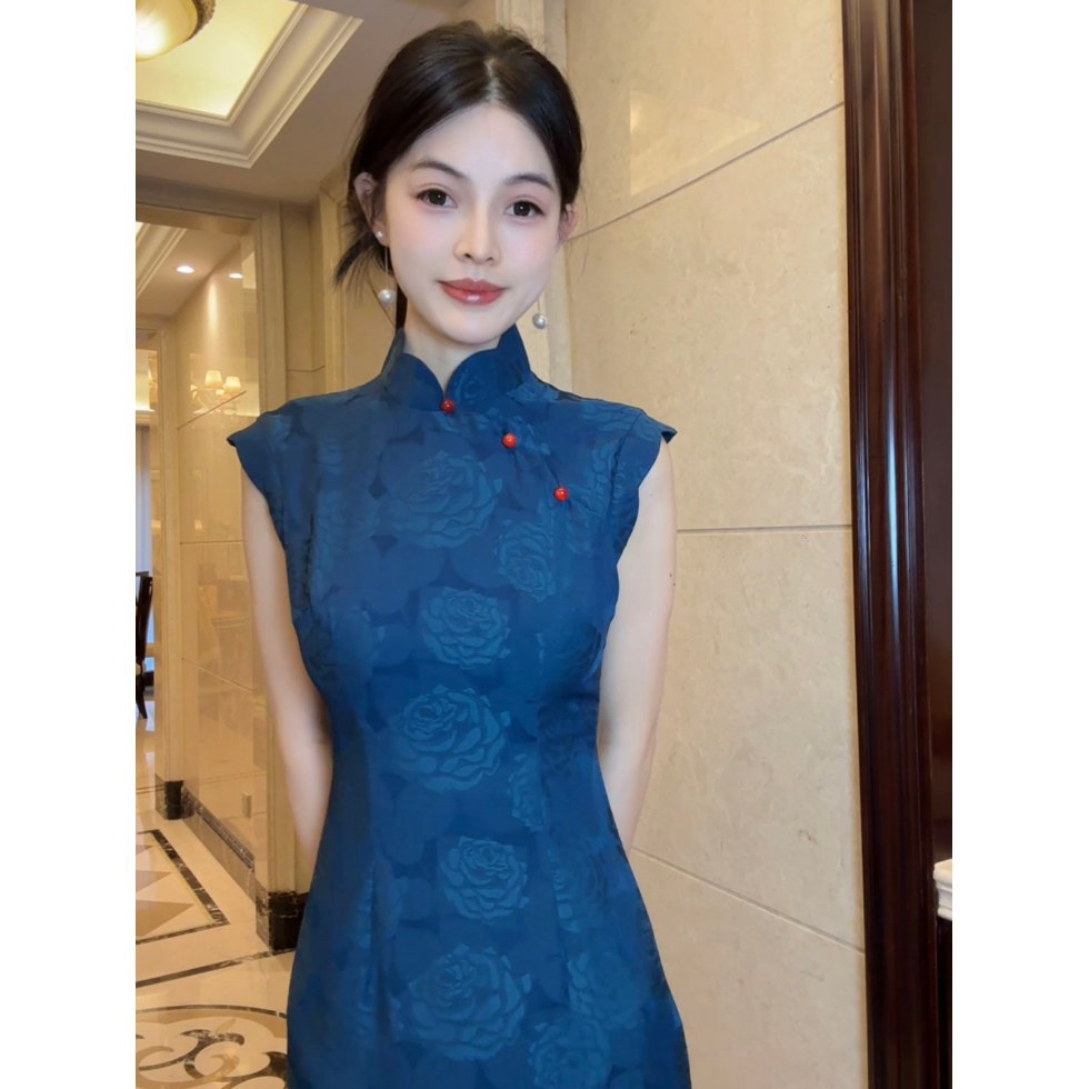 ブルー2025年夏新作白文芸書香気国風修身古法高級日常チャイナドレス