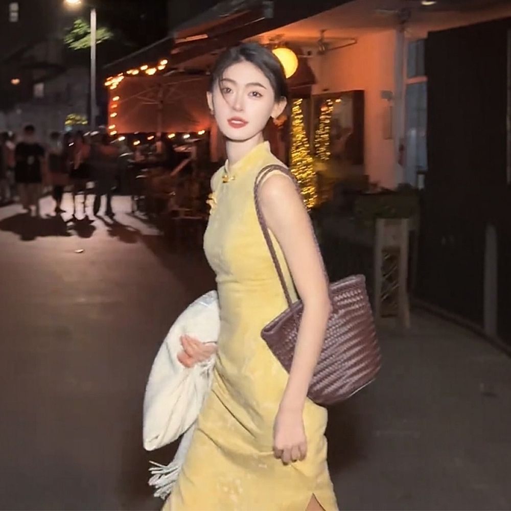 【希望通り】新中国式黄色袖なし改良チャイナドレス女性春夏ジャカード絶美修身ウエストワンピース