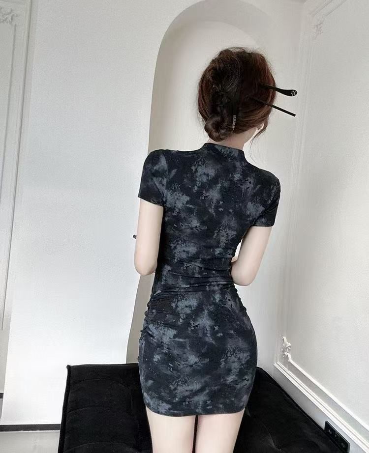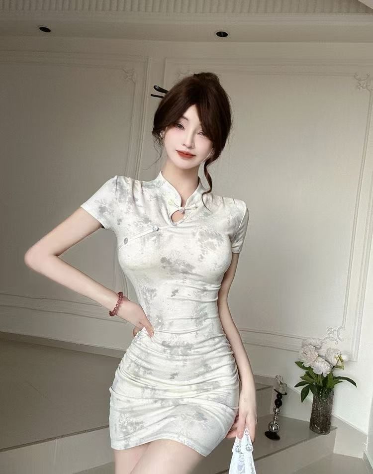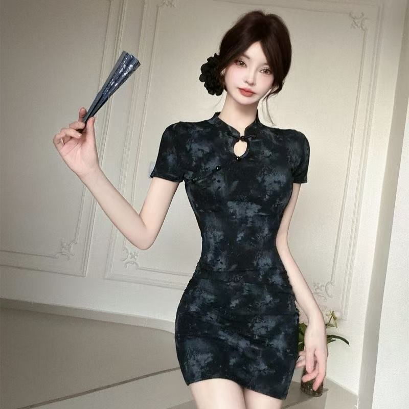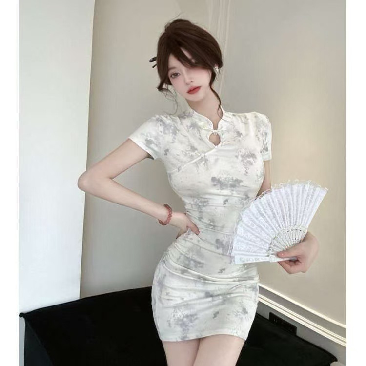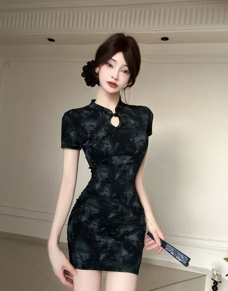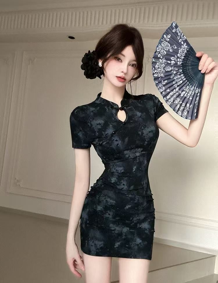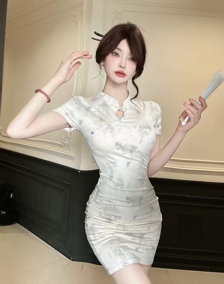 2025年夏季新款新中式国风年轻款改良印花旗袍短款紧身包臀连衣裙