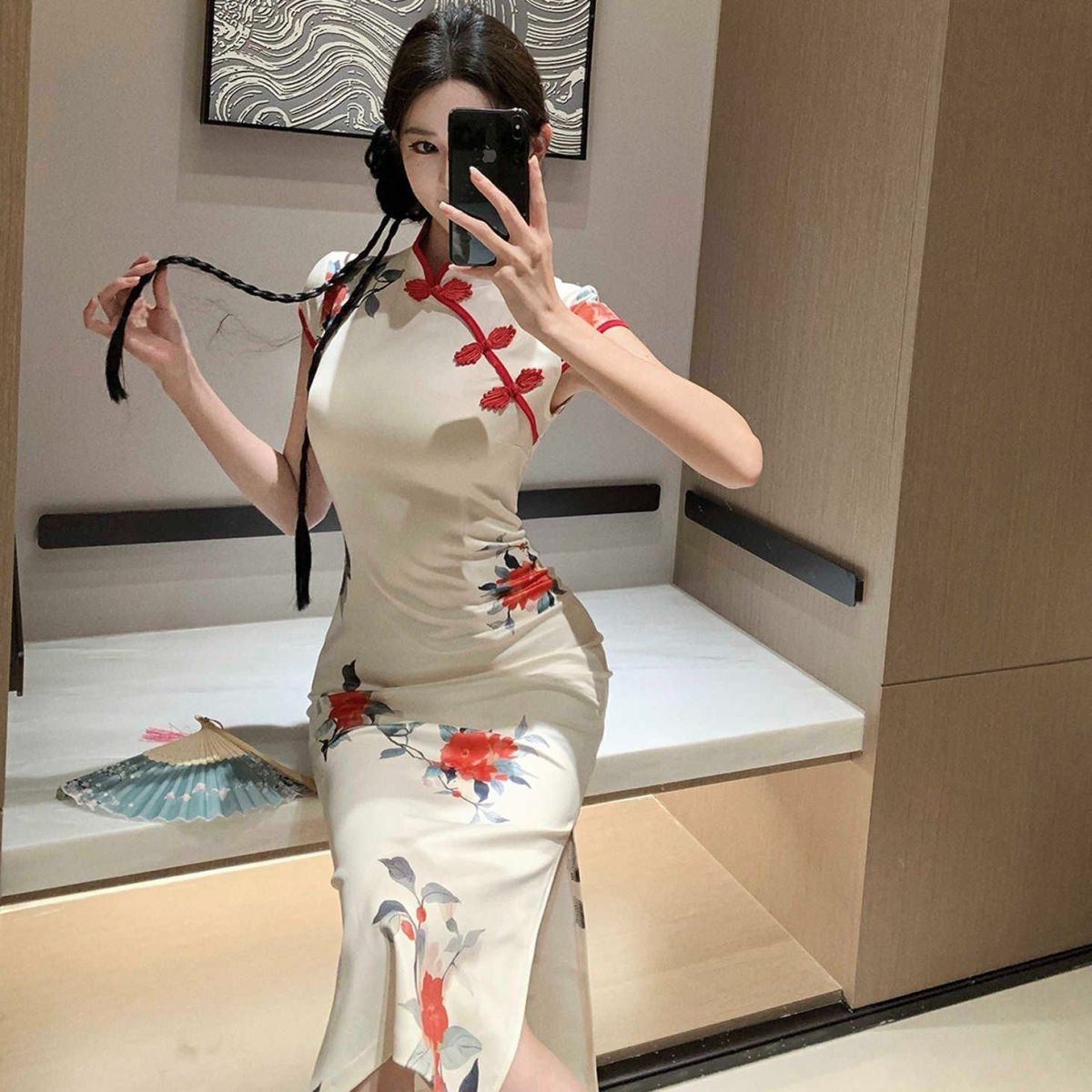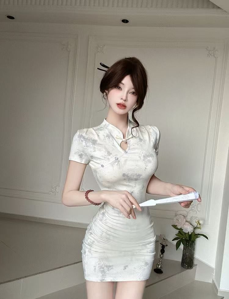 2026年夏の新作、新中華風、若者向け改良版プリント旗袍、ショート丈タイトフィットワンピース