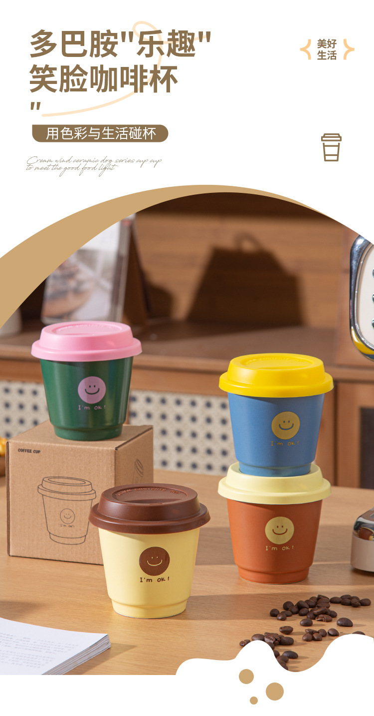 カラードーパミン笑顔コーヒーカップミニカバー付き陶磁器カップ男女オフィス用小型コップ