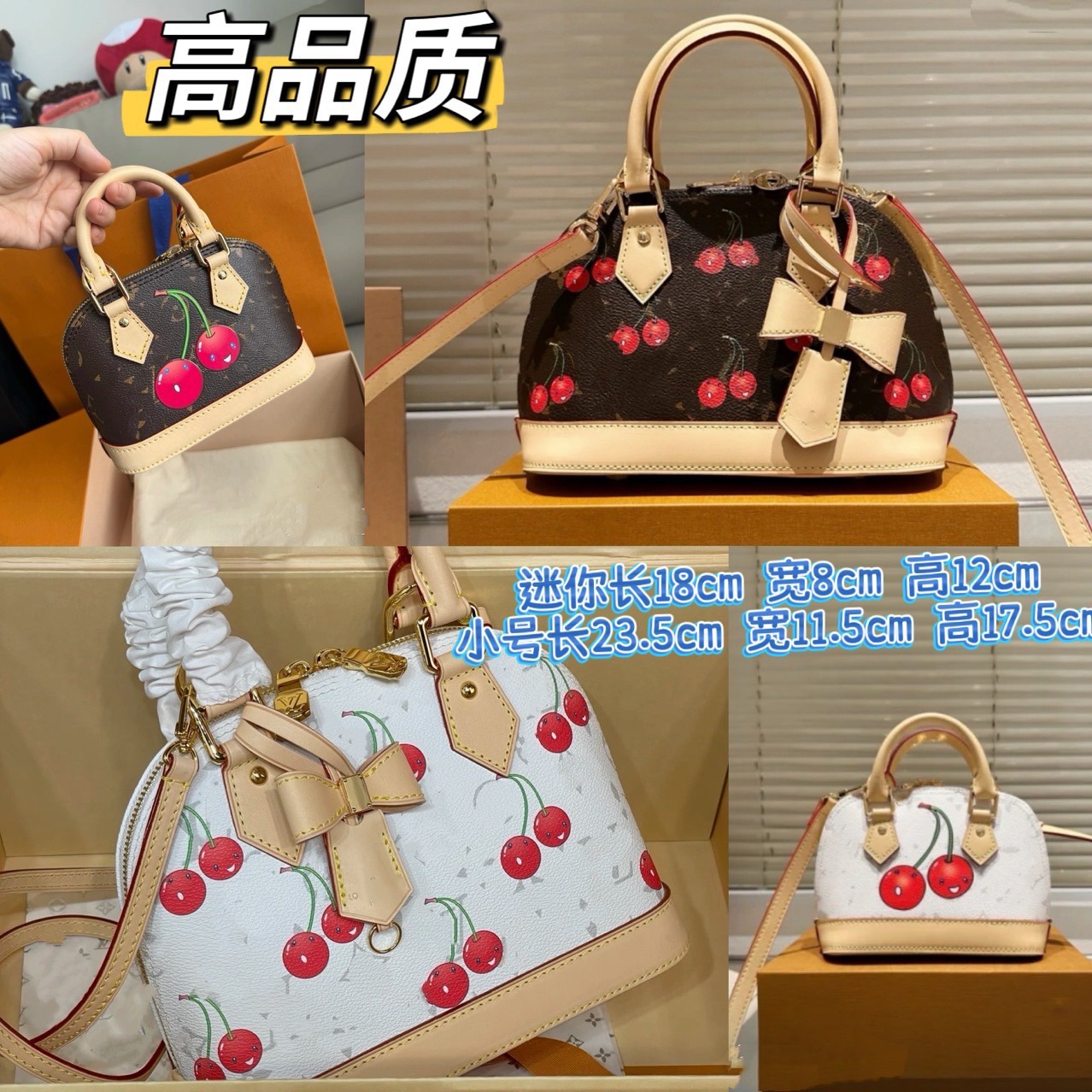 2025 新プリントチェリーシリーズハンドヘルドレディースバッグ本革老眼シェルバッグファッショナブルで多用途なシングルショルダークロスボディバッグ
