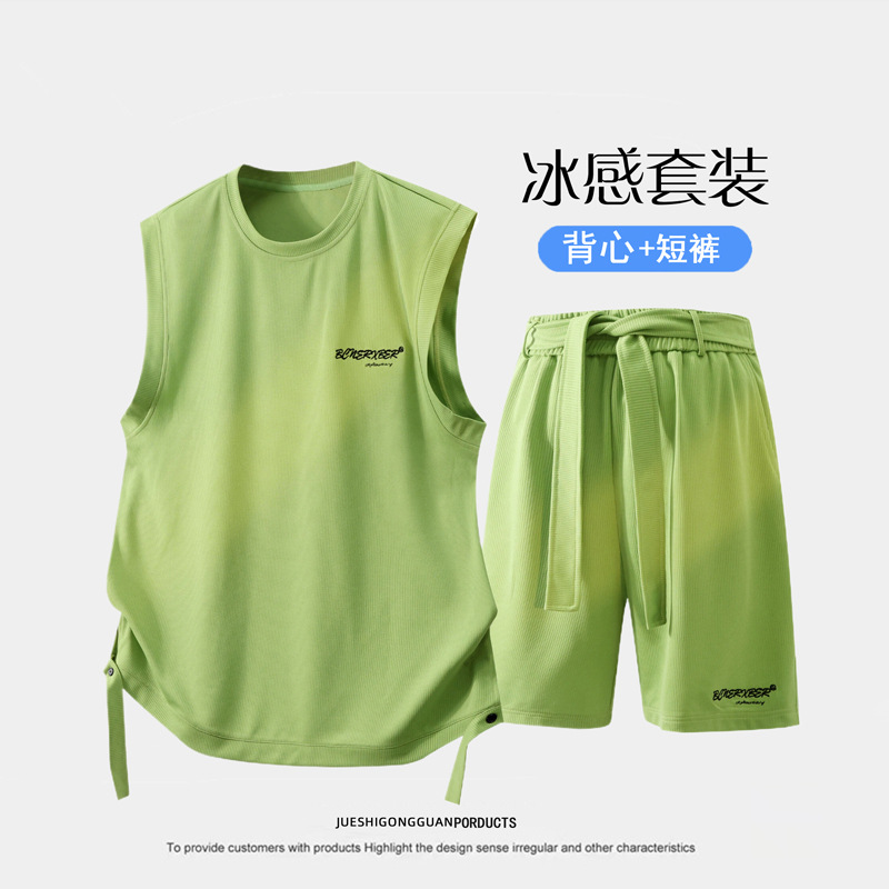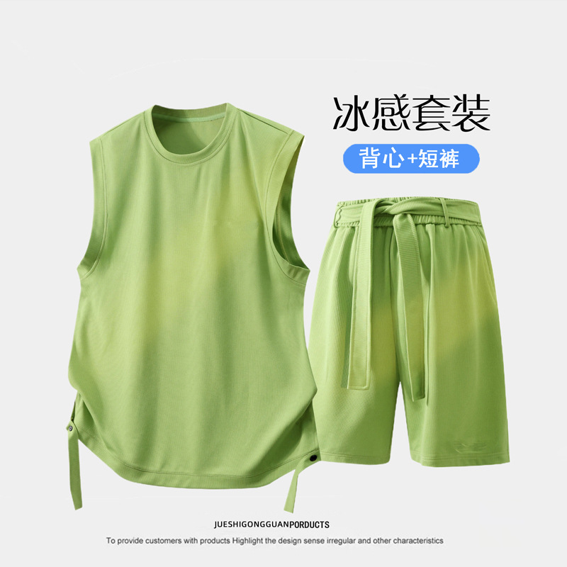 夏アボカドグリーンベストショーツスーツメンズリラックス大きいサイズノースリーブTシャツとスポーツウェアの完全なセット