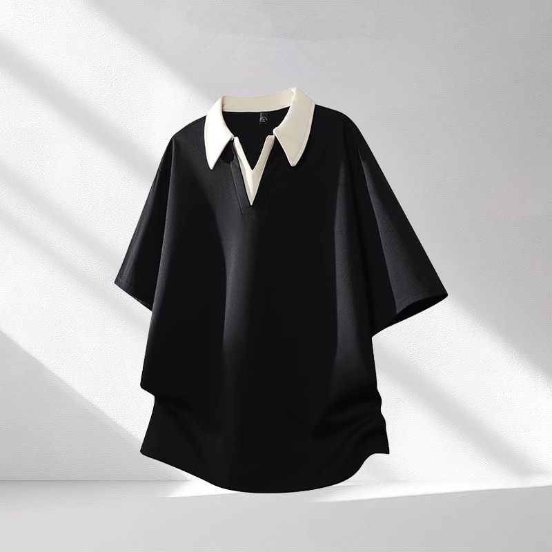 アメリカンカジュアルコントラストカラー半袖メンズ夏薄いフェイクツーピースポロシャツ大きいサイズルーズ半袖VネックTシャツトップ