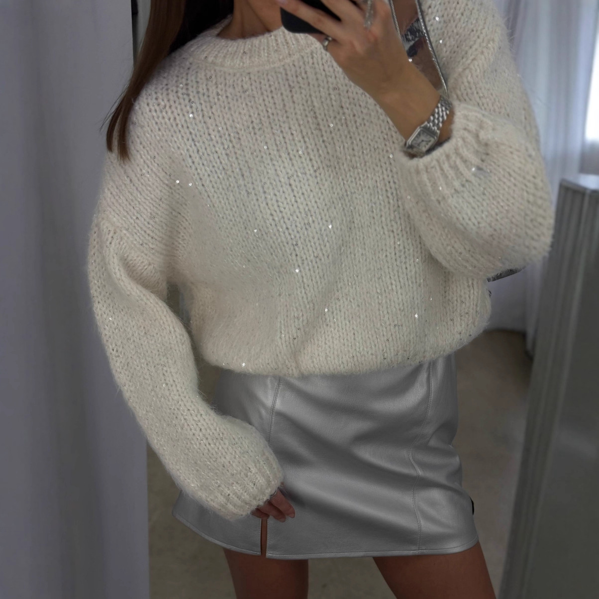 2026女装秋冬新款珠片针织衫宽松复古慵懒风显瘦灰白两色圆领毛衣