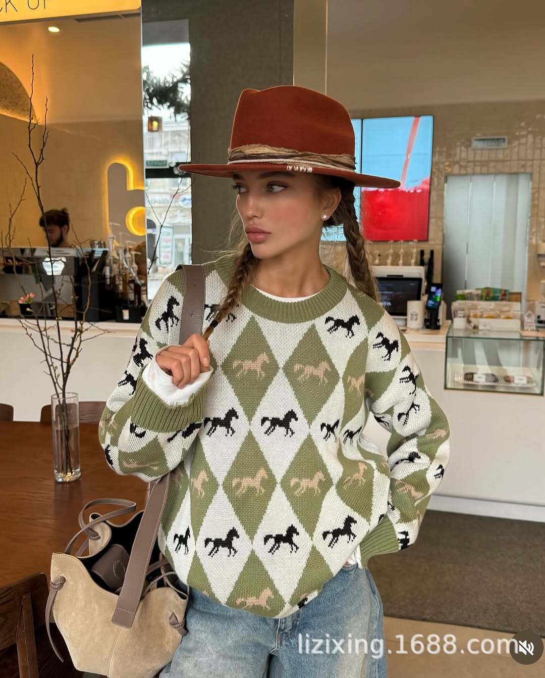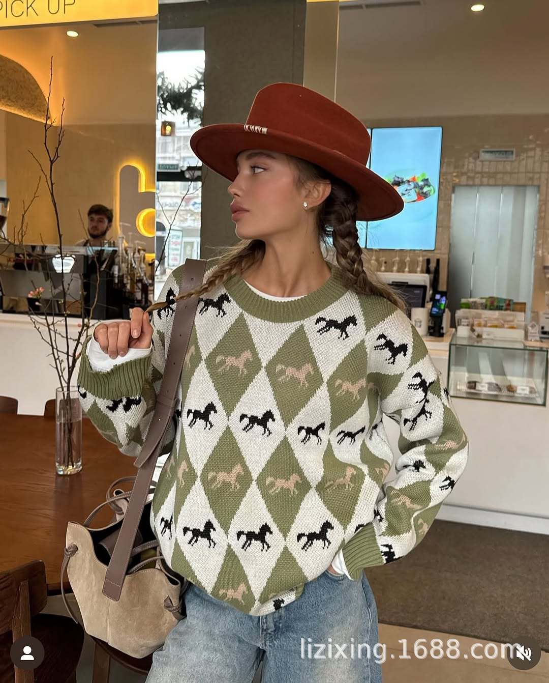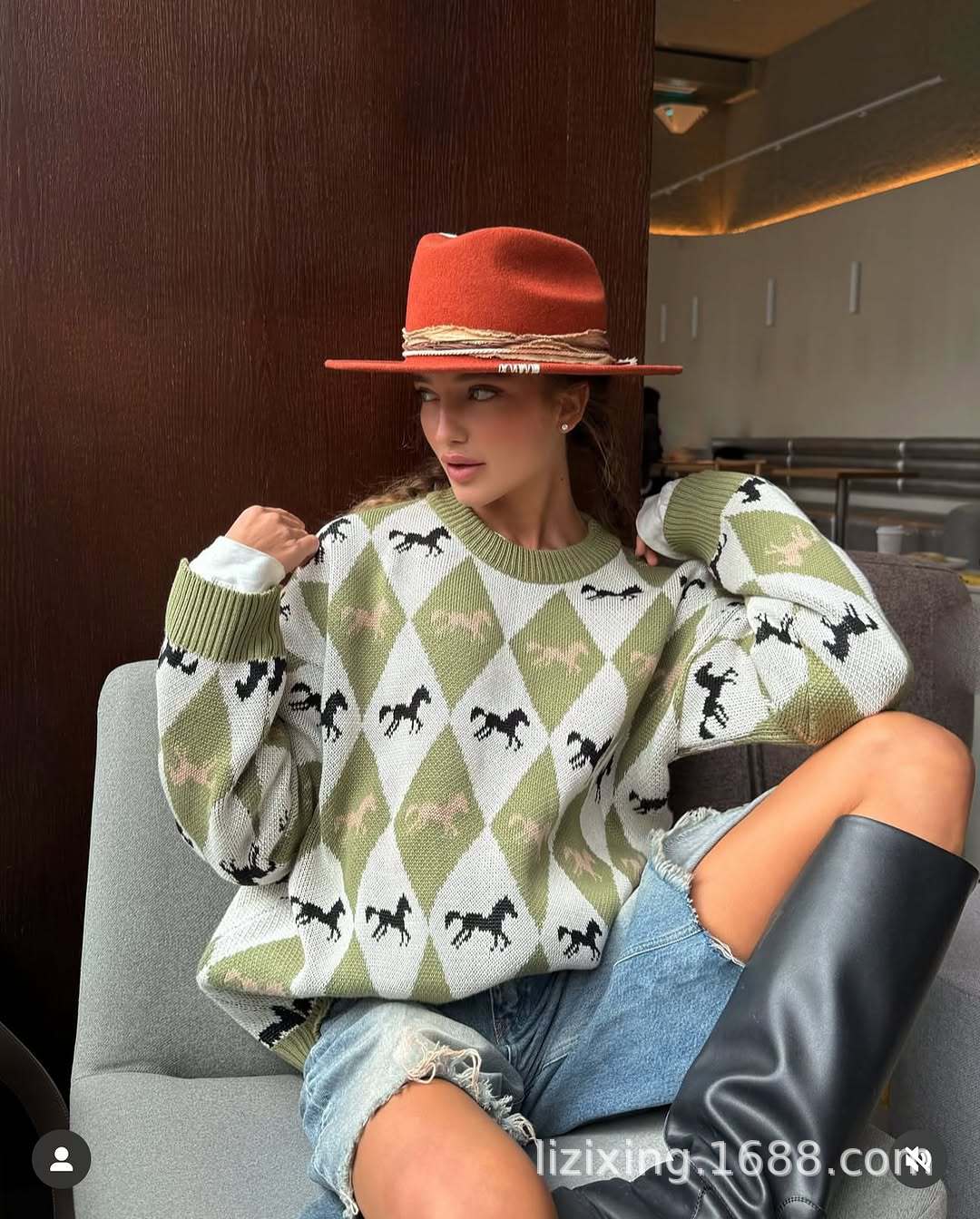 (粗针)欧美2025春秋新款撞色菱格毛衣女 宽松慵懒百搭圆领套头