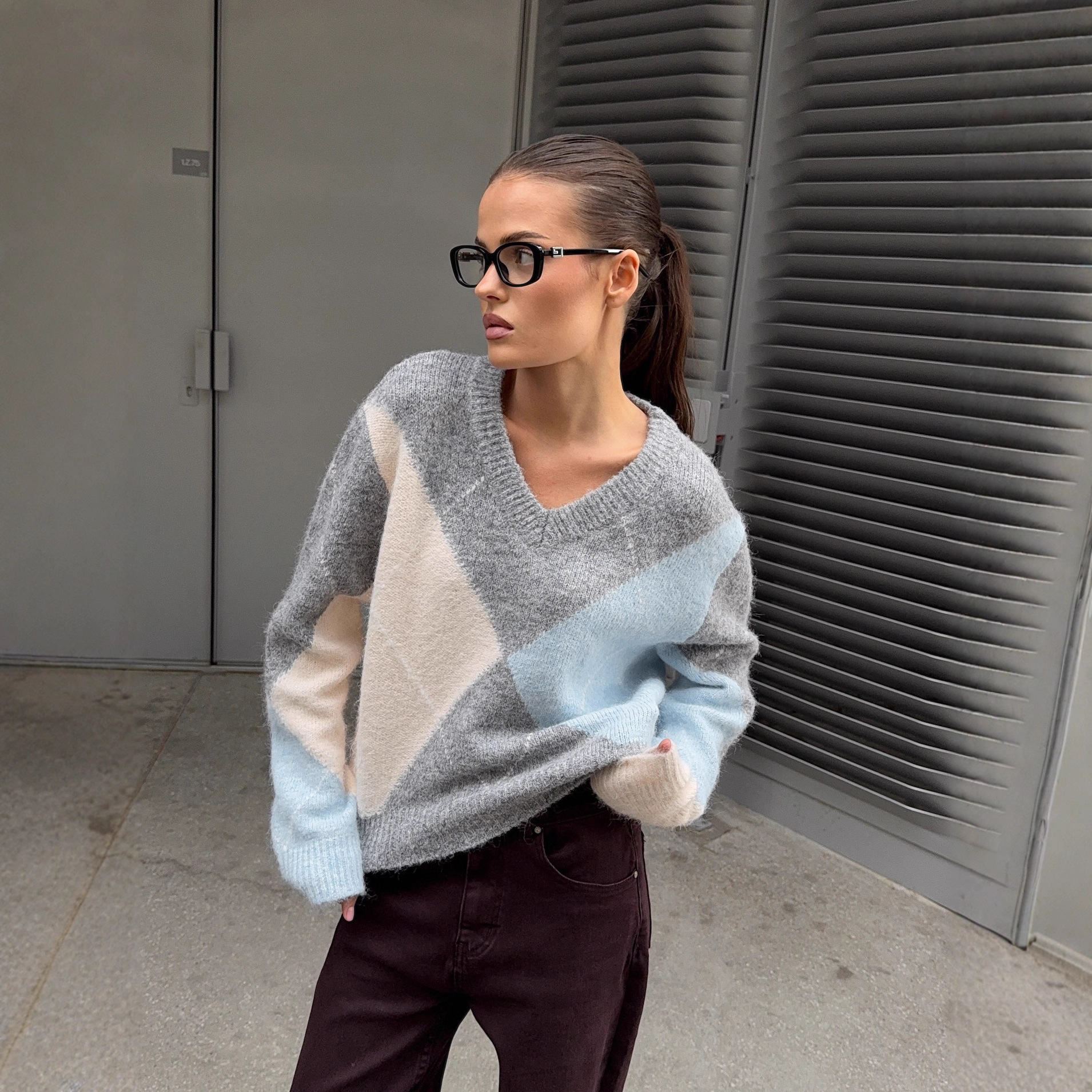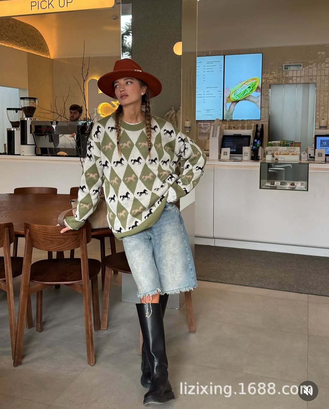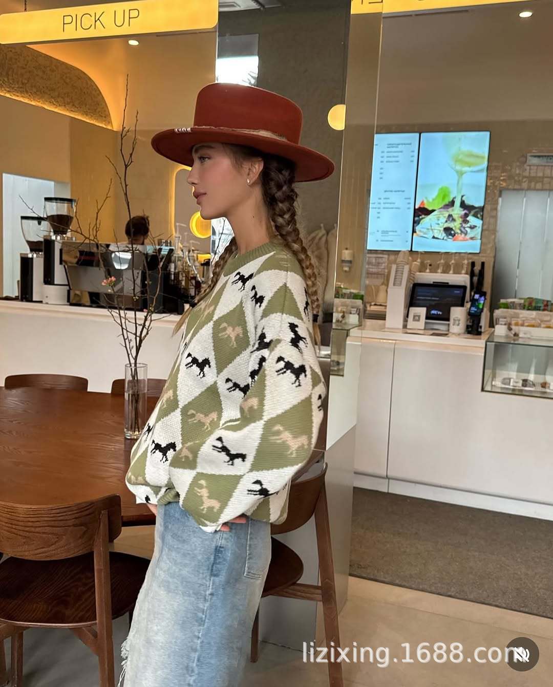 (粗针)欧美2025春秋新款撞色菱格毛衣女 宽松慵懒百搭圆领套头