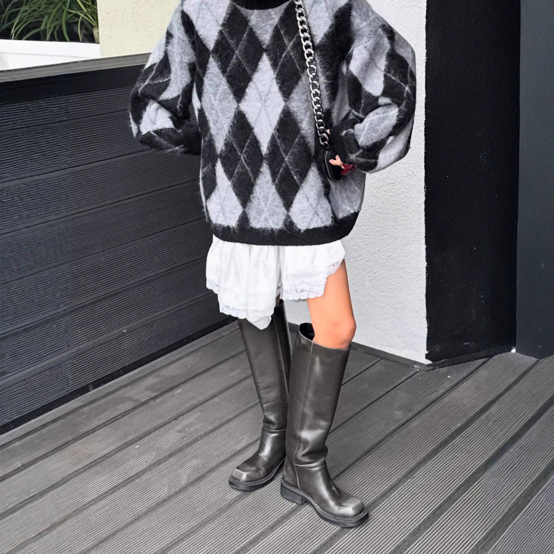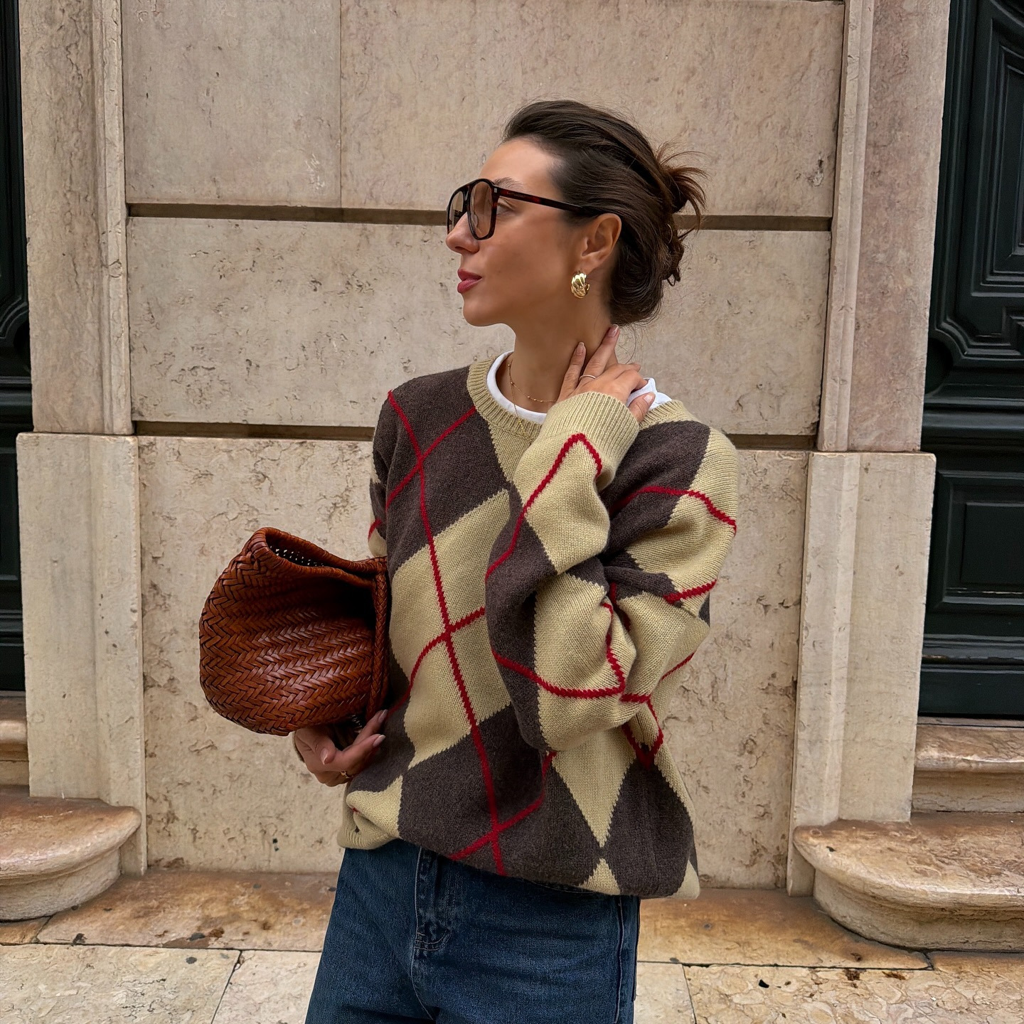 北欧经典菱格纹潮流圆领套头毛衣 秋冬季保暖设计感长袖针织衫女