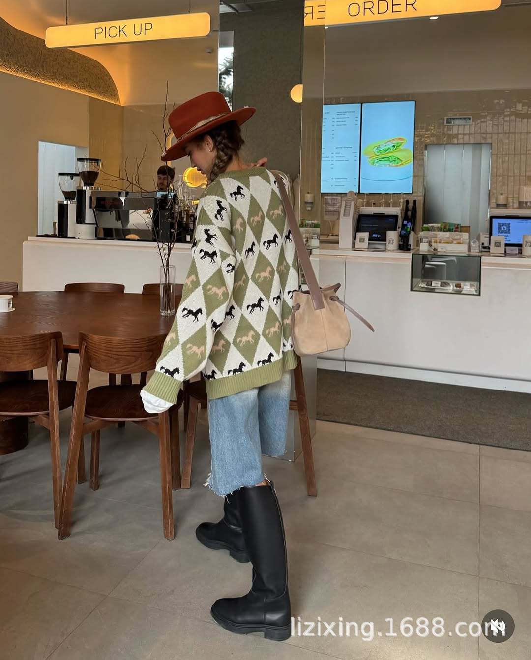 2025秋冬菱格撞色圆领毛衣女秋冬外套百搭休闲慵懒风针织衫女批发