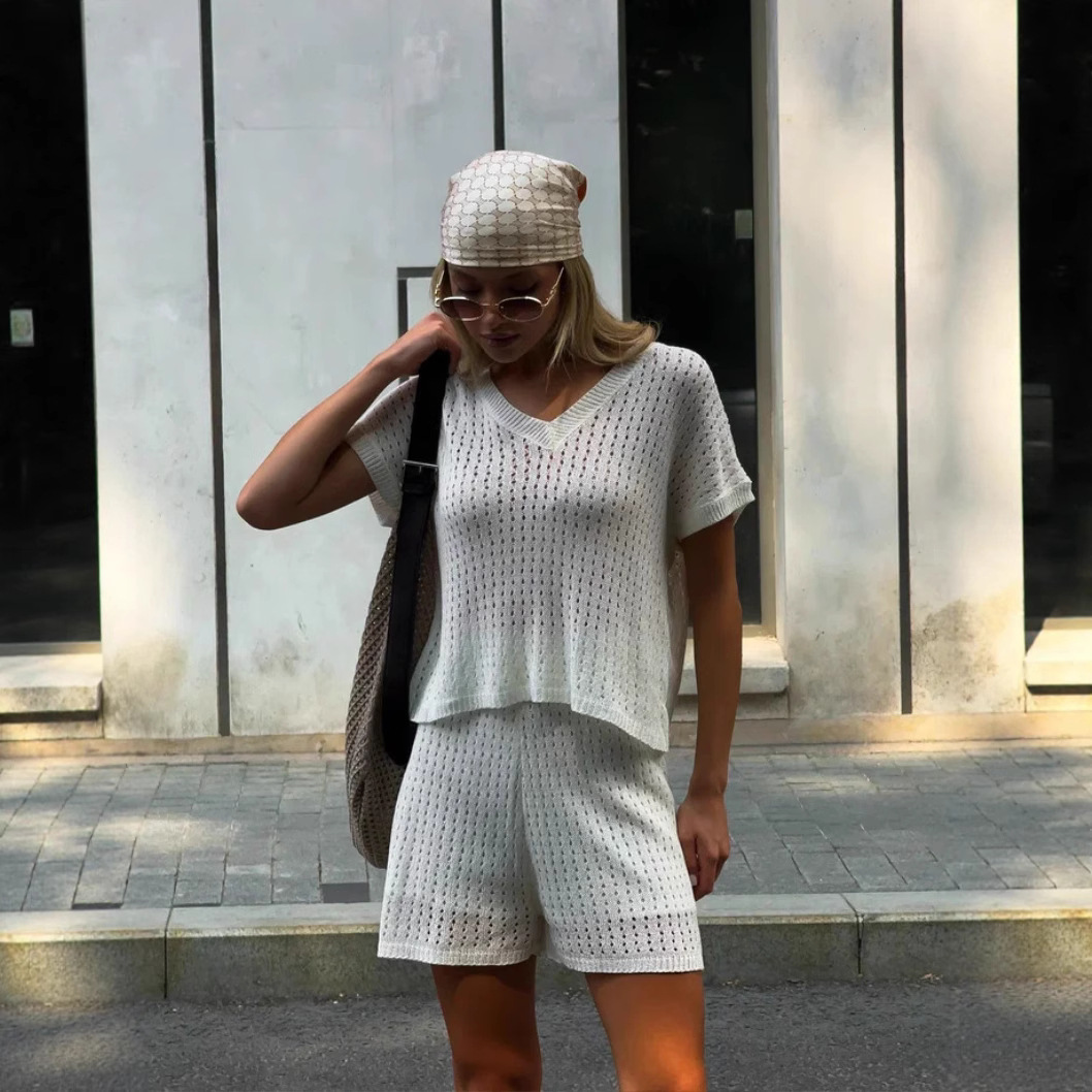 ソリッドカラー中空ニットハイウエストショーツツーピースセット女性の夏のシンプルなカジュアルファッション Tシャツニットスーツ女性