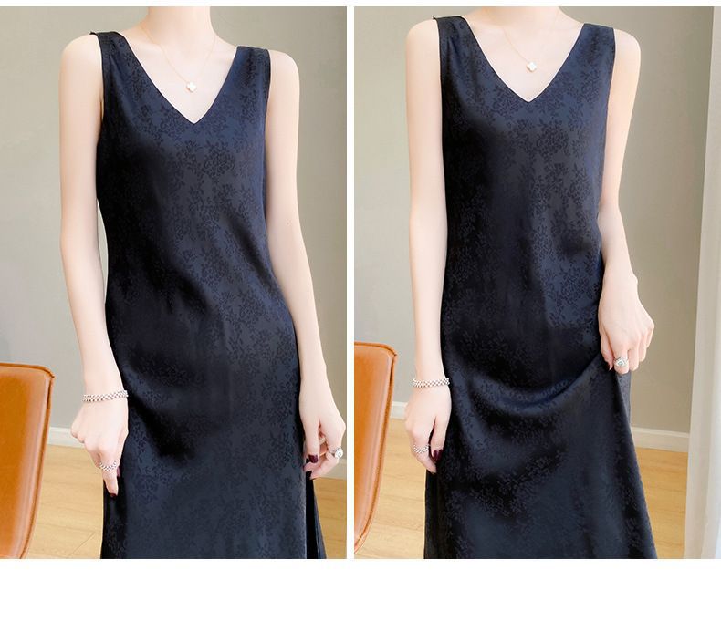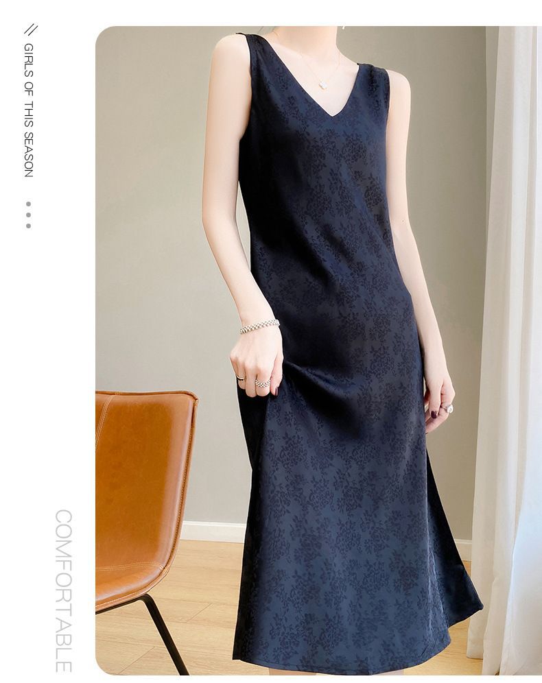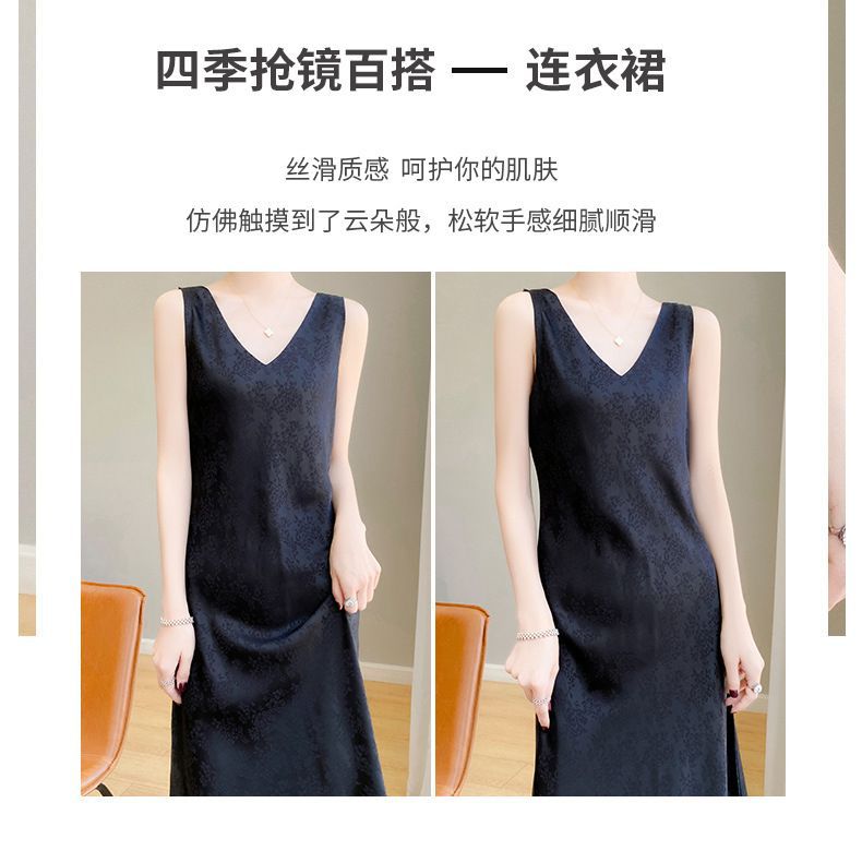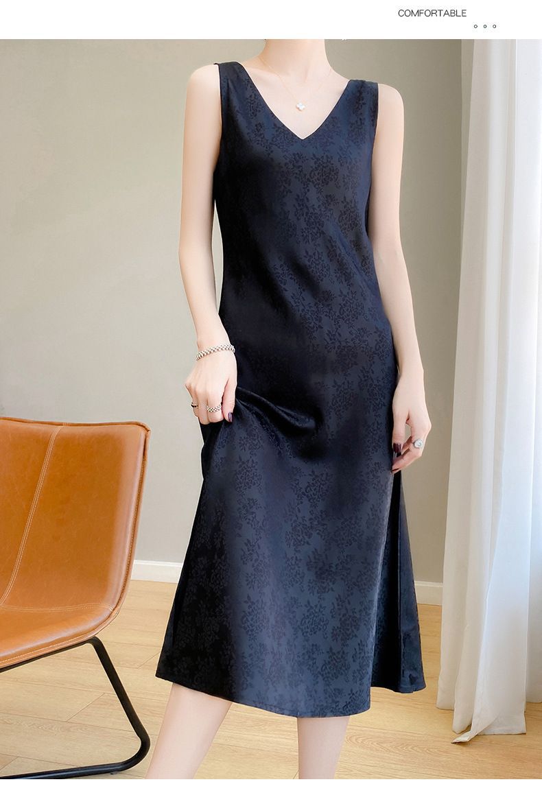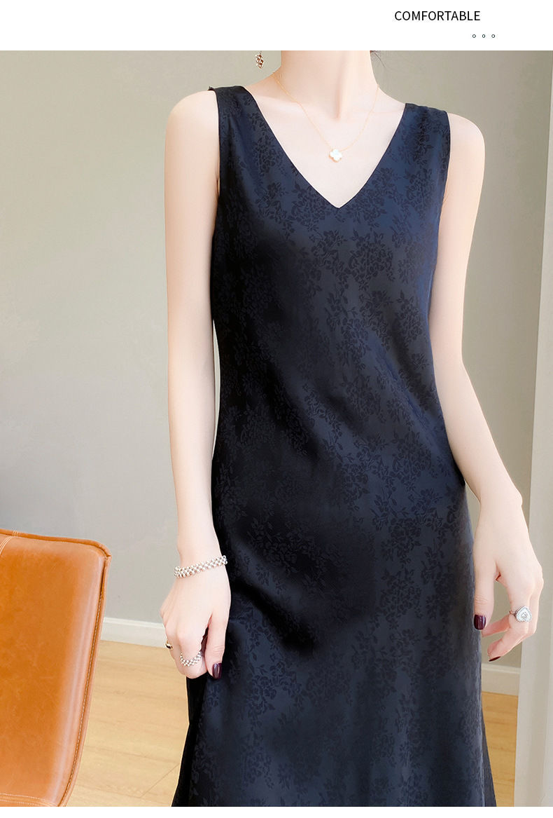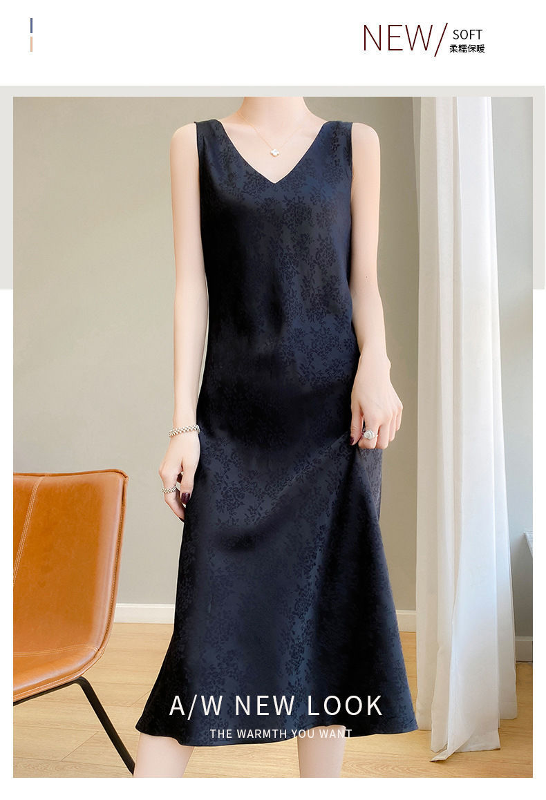 サテンジャカードワンピース Vネック レディース ロング丈 膝下丈 着痩せ効果 多彩な着こなし ファッション ベストワンピース 新作 立体ジャカード
