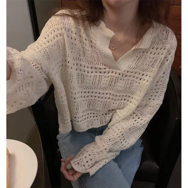 韓国の春と夏のフレンチレイジースタイルカラープルオーバー中空かぎ針編みルーズカジュアルショートニットセーター女性用