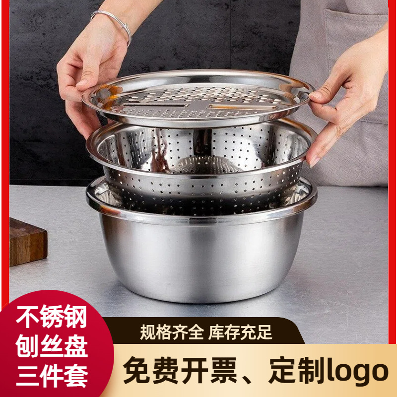 三件套不锈钢刨丝盘切菜神器调料缸沥水篮洗菜家用盆套装盆多功能