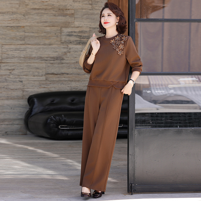 ママ服、秋、春、中高年向けの新しいファッション長袖カジュアルスーツ、洋風トップスとパンツ、肉感をカバーする2点セット