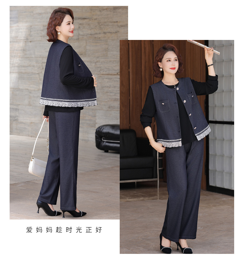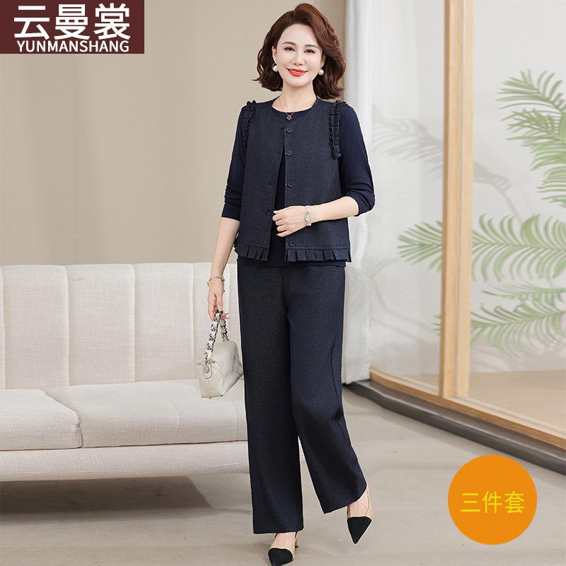 妈妈端庄大气套装秋装马甲外套中老年人春秋打底衫上衣服三件套女