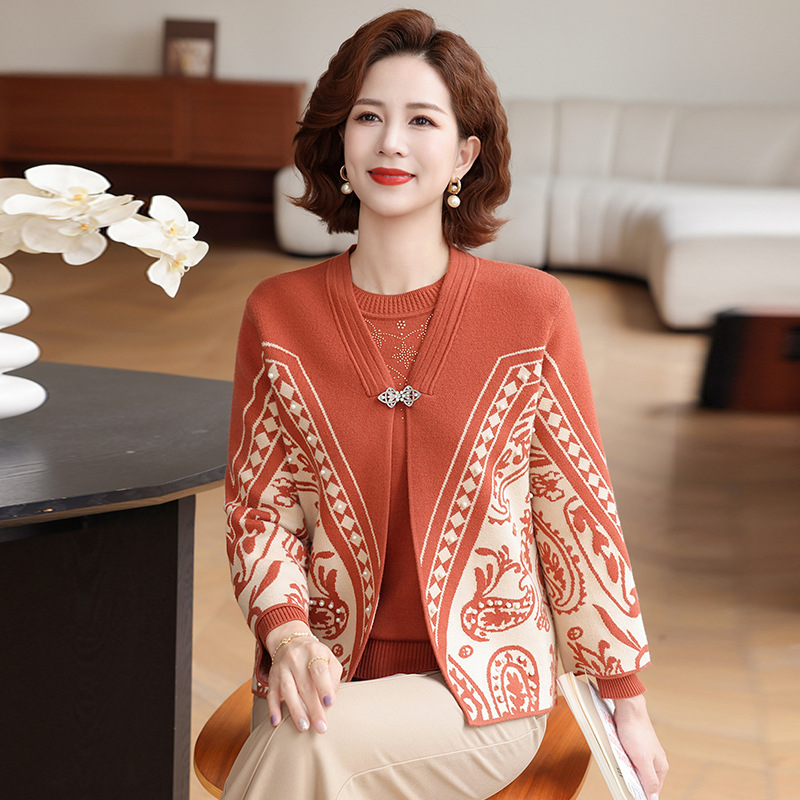 ママの秋スタイルニットカーディガン中年春秋冬ショールトップ中高年ファッションカジュアルタワージャケット