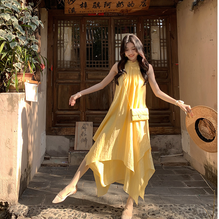 海边度假连衣裙高级感黄色挂脖长裙吊带胸垫露背沙滩裙女三亚穿搭