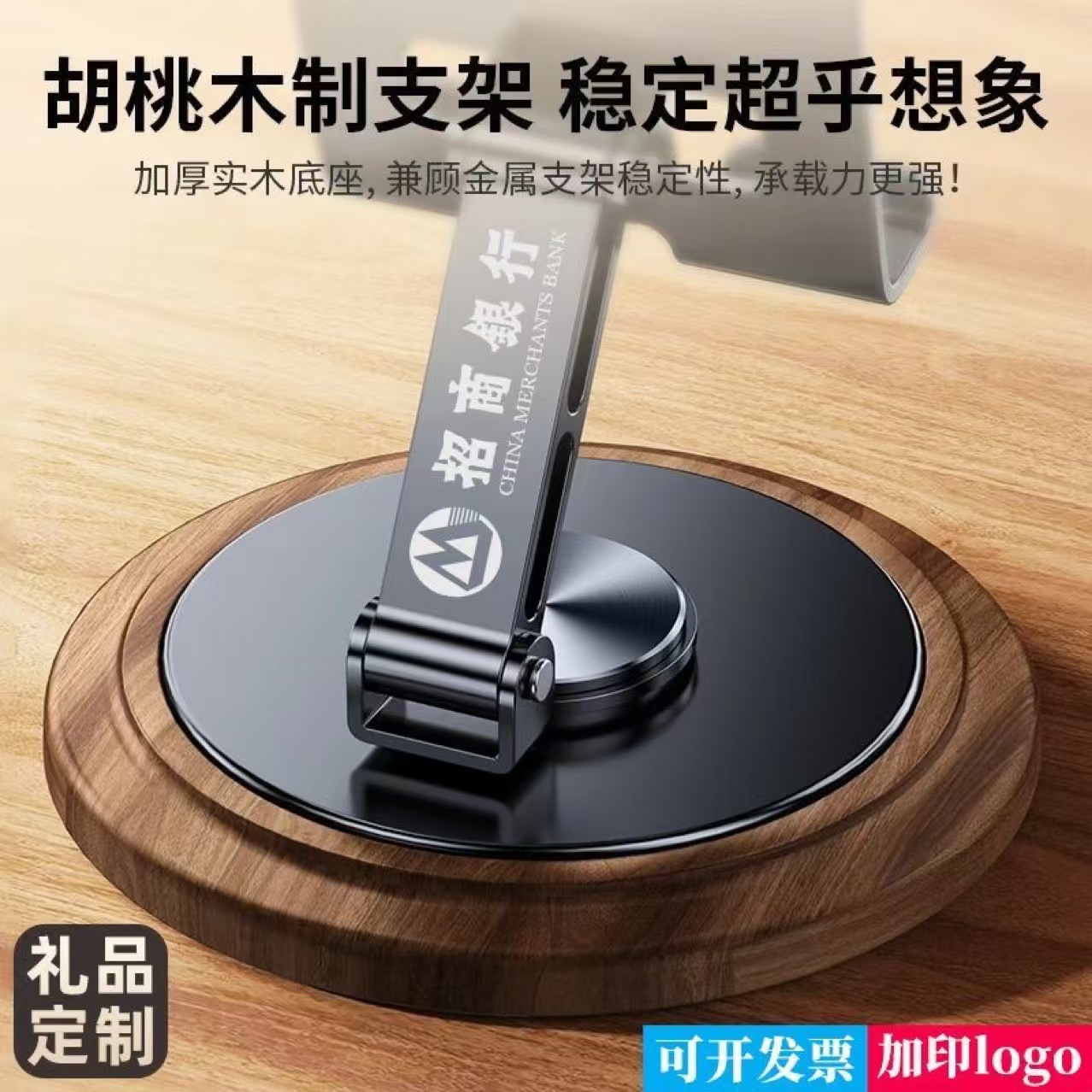 胡桃木纹手机支架桌面金属可旋转折叠便携平板通用礼品logo外贸