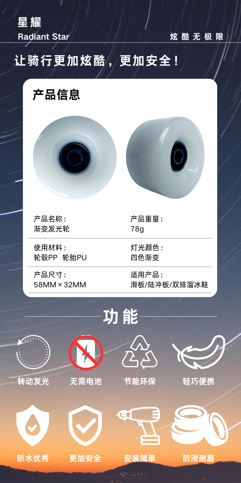 発电ホイール自発电新品スケートボード用15030PU発电ホイール85APU 82APU発光ホイール