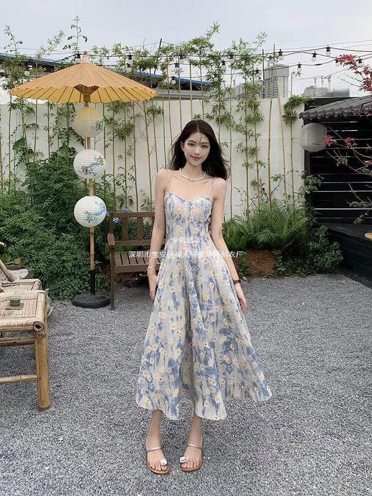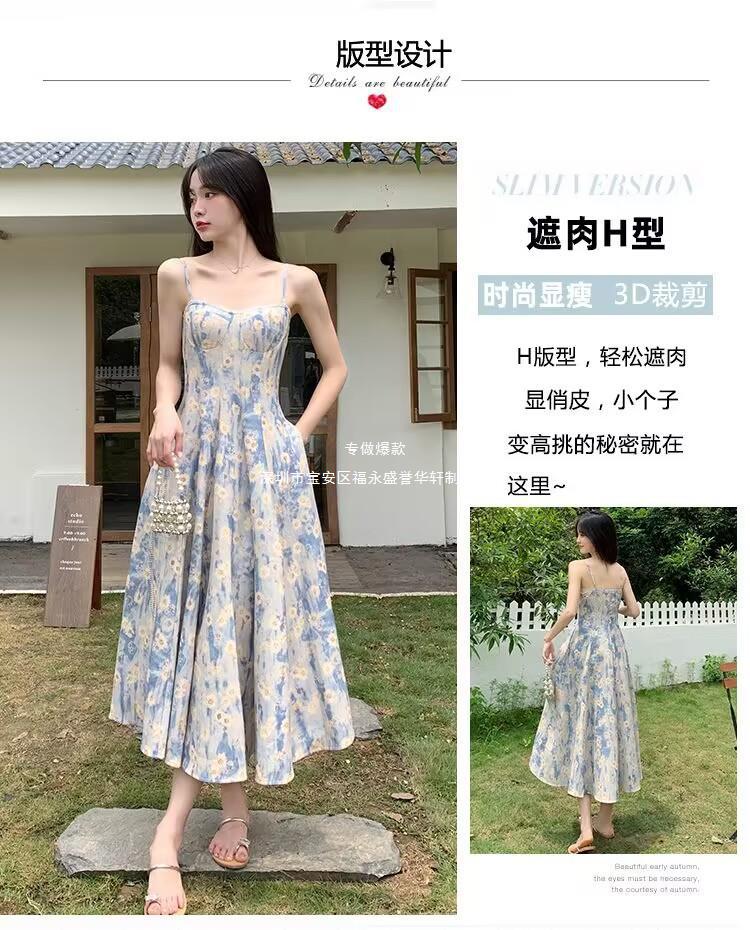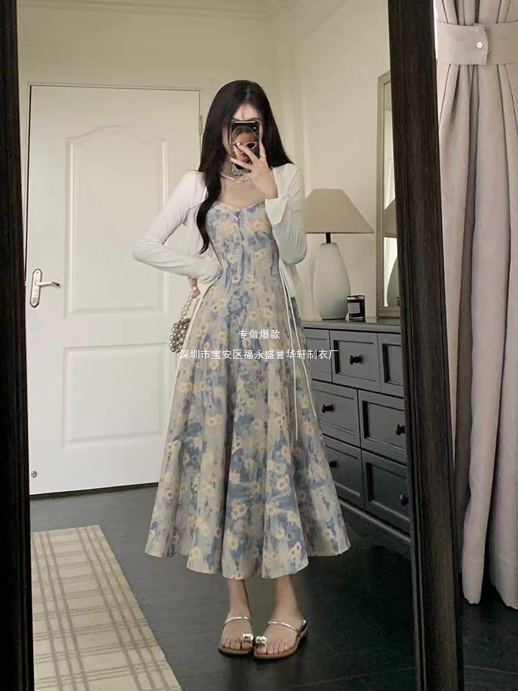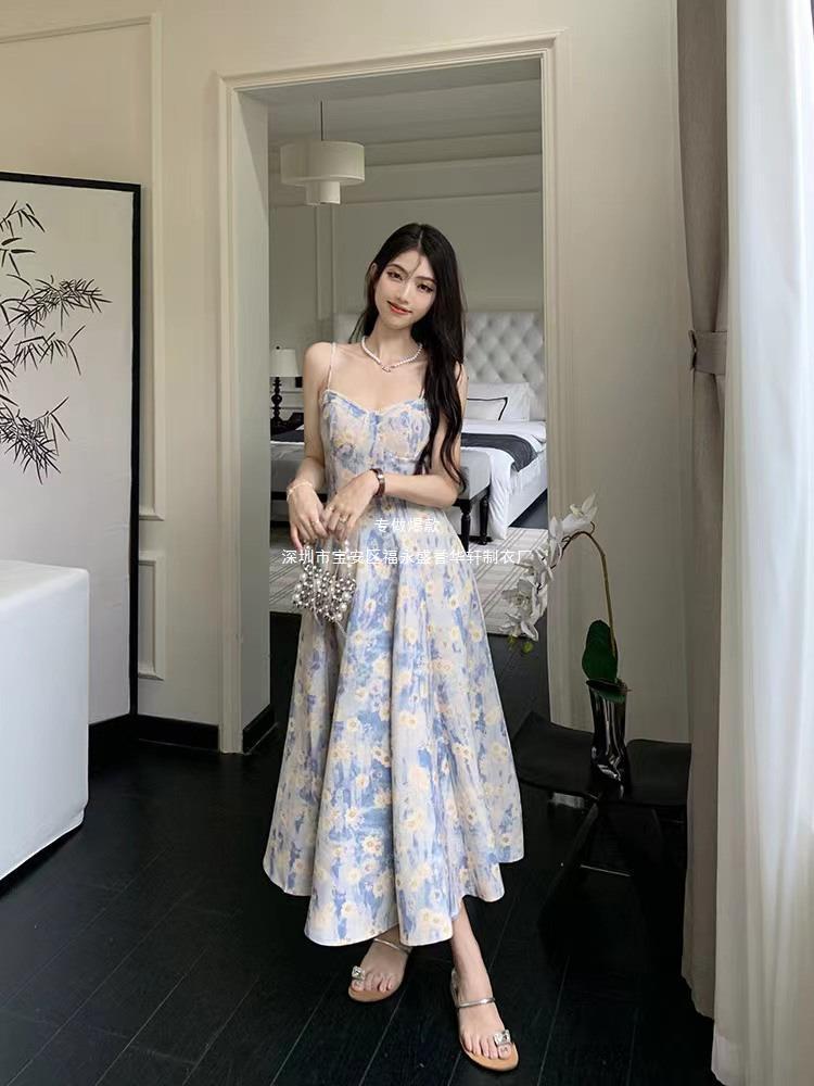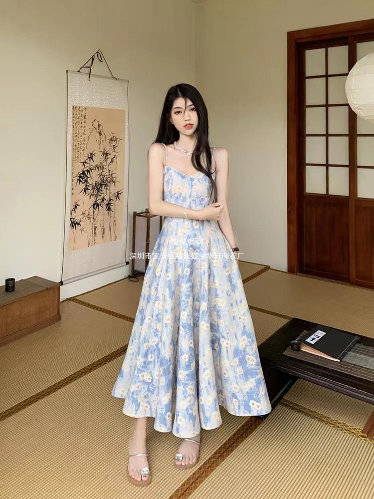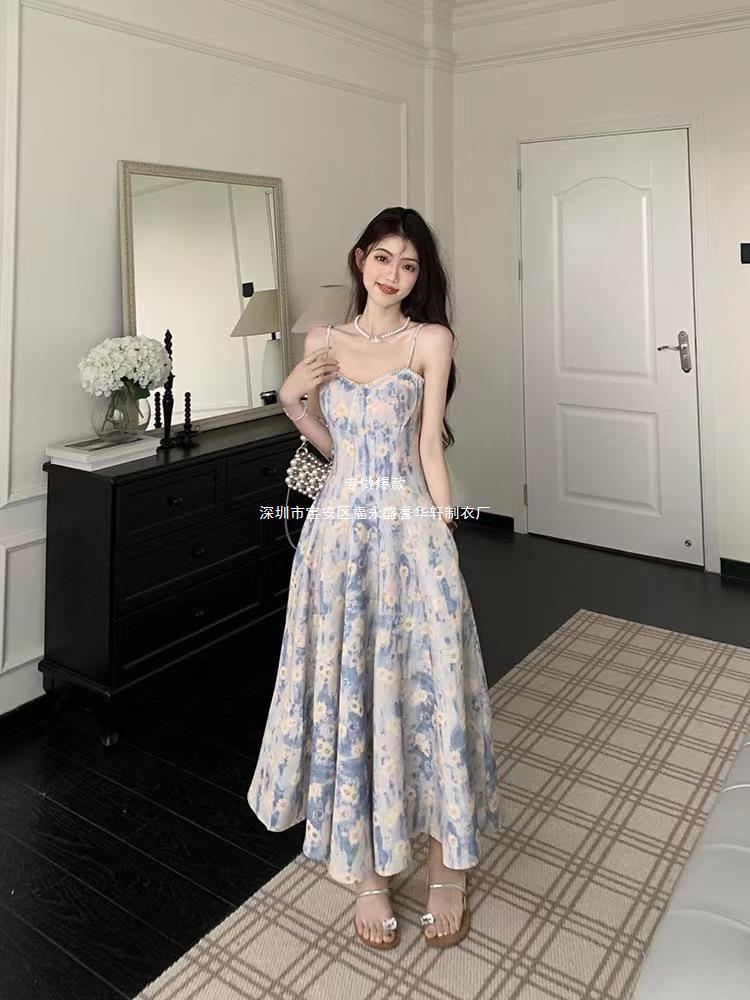 フランスの青い油絵の花のストラップのワンピースの女性の春の夏の新型は腰の甘いアンドロメダの気質の中で長いスカートを収めます。