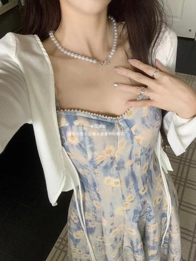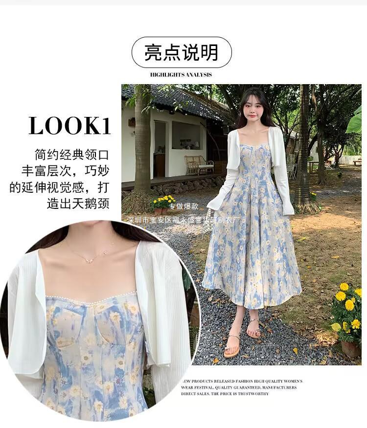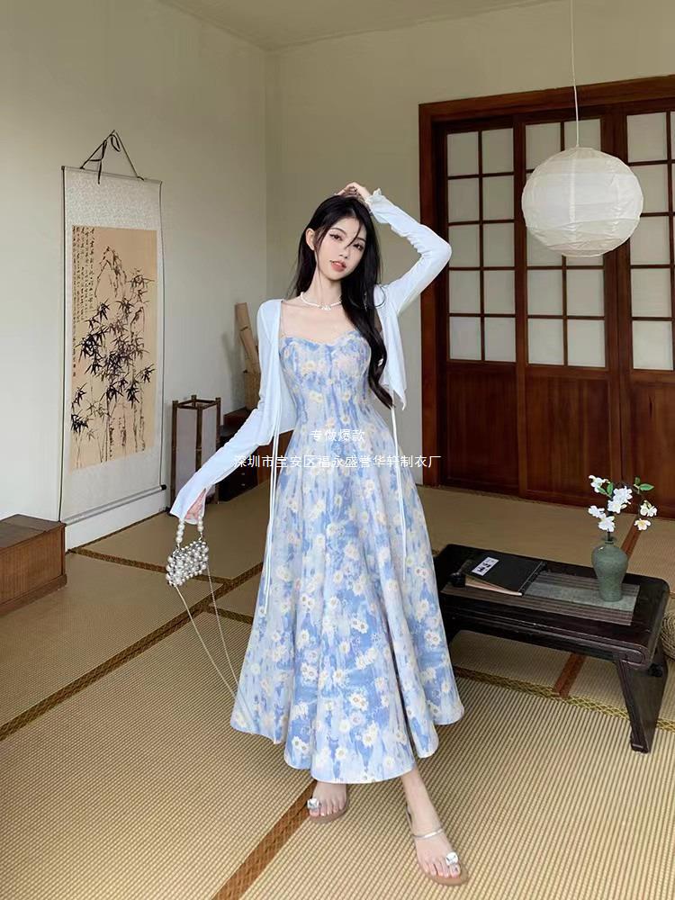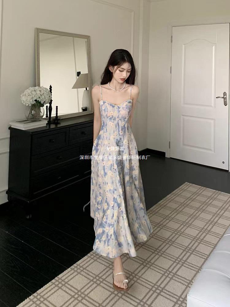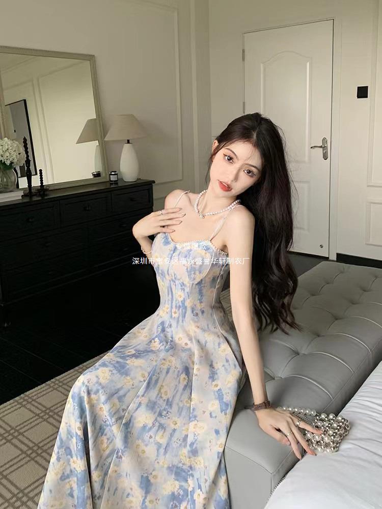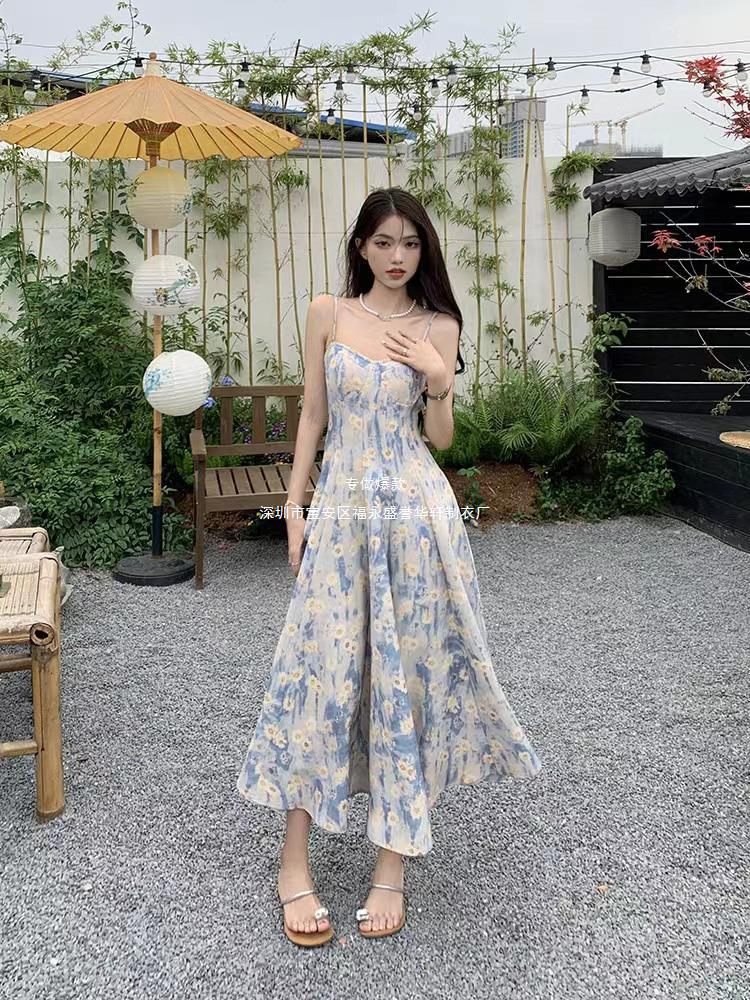 フランスの青い油絵の花のストラップのワンピースの女性の春の夏の新型は腰の甘いアンドロメダの気質の中で長いスカートを収めます。