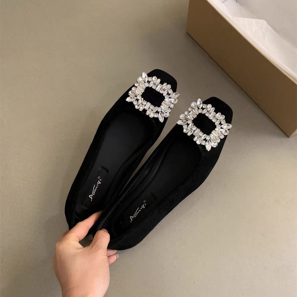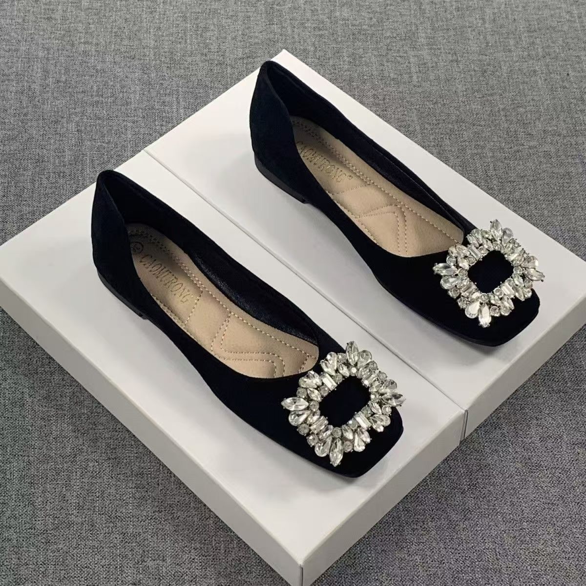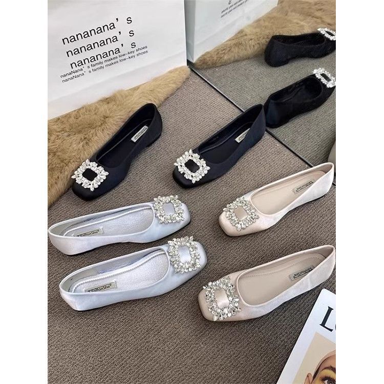 ファッショナブルで多用途なフレンチスクエアトゥフラットシューズ女性用2025秋の新しい妖精の靴ラインストーンバックル気質ソフトソールシューズ