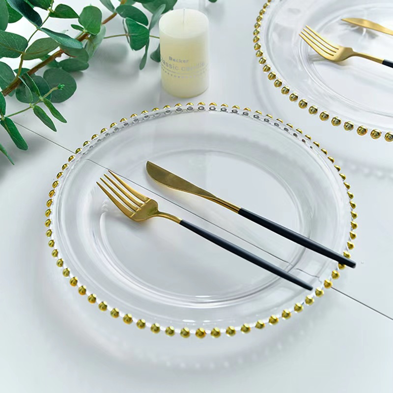 ヨーロッパ風洋食プレート、ホテル用電気メッキディナープレート、日本と韓国のビーズドットガラスゴールドビーズプレート、丸皿、サラダプレート、北欧スタイル