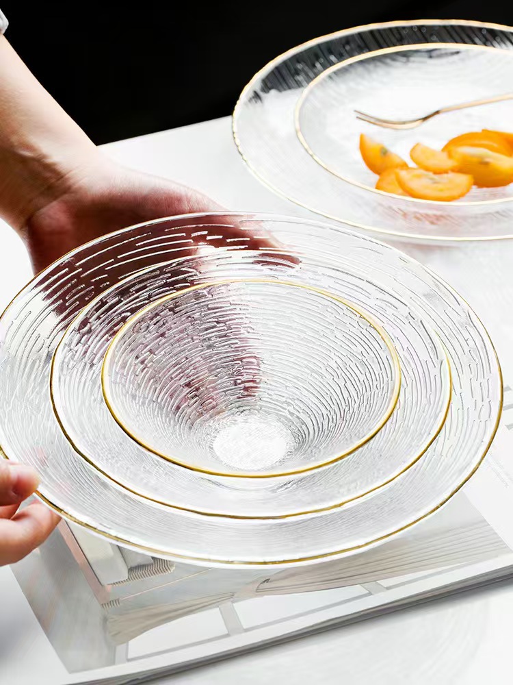 和風横縞ガラス皿 家庭用透明食器皿 洋食ガラスフルーツサラダボウル ディナープレート 皿卸売