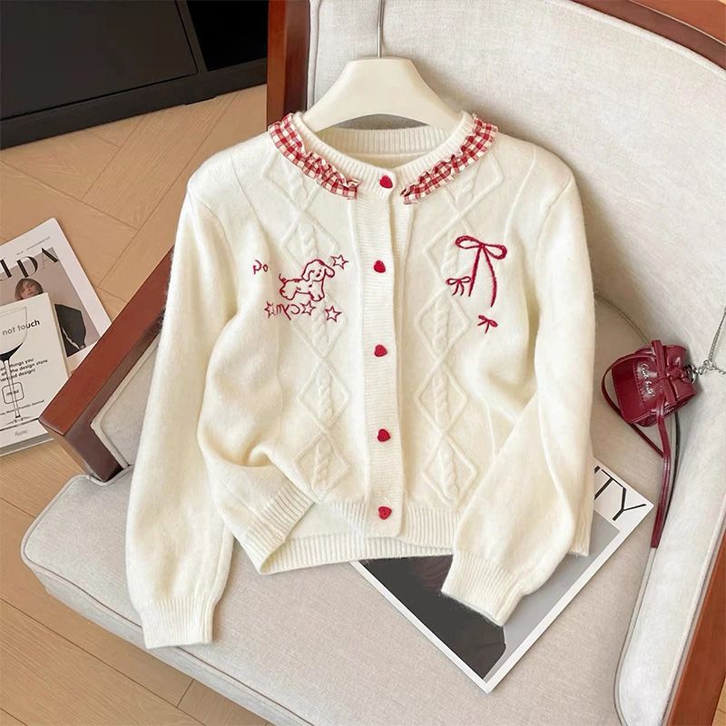 小狗刺绣蝴蝶结春秋新款爱心毛衣开衫甜美减龄针织衫针织外套上衣