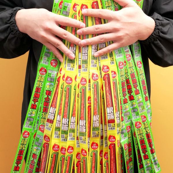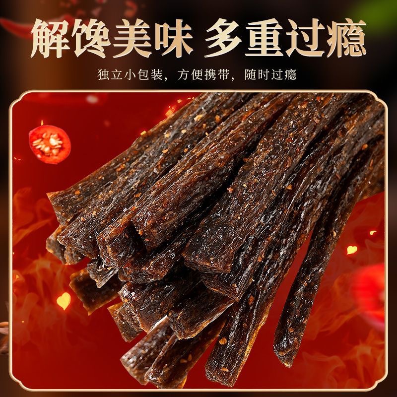 Dr. Jinfeng 牛すじ、植物性牛すじ、牛すじ風味のスパイシーストリップ、懐かしいスパイシーグルテンスナック、スナック食品