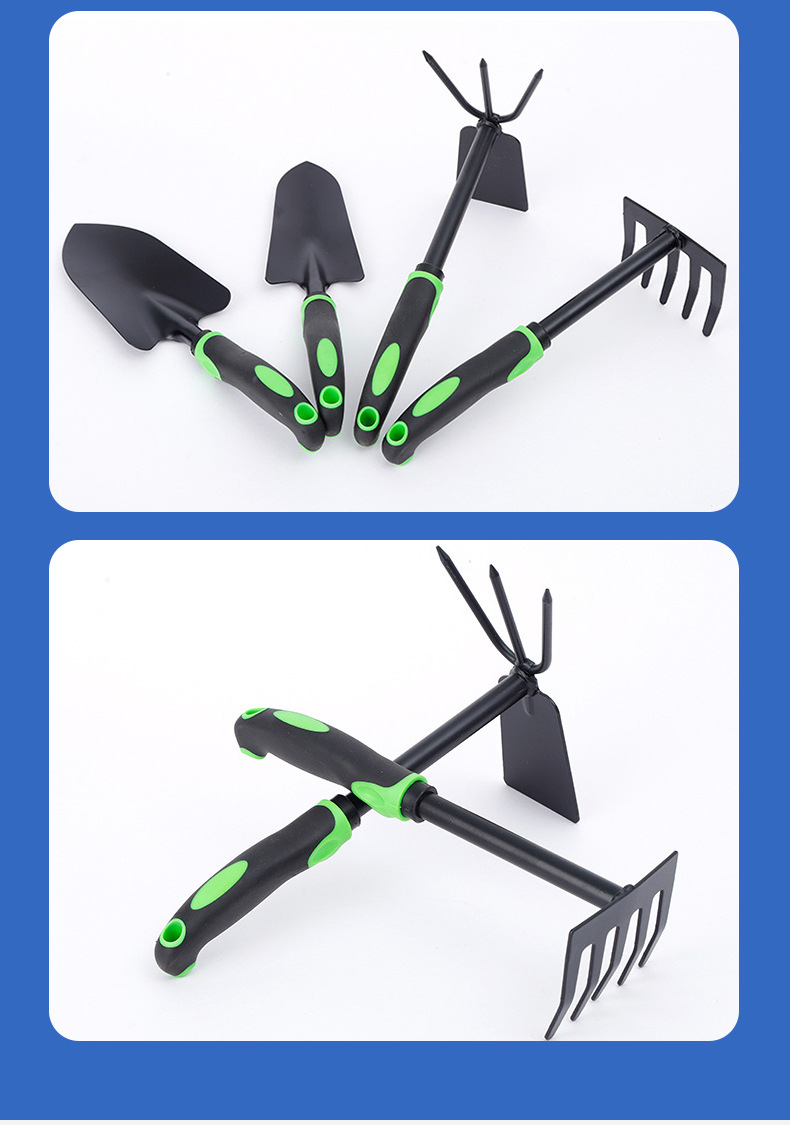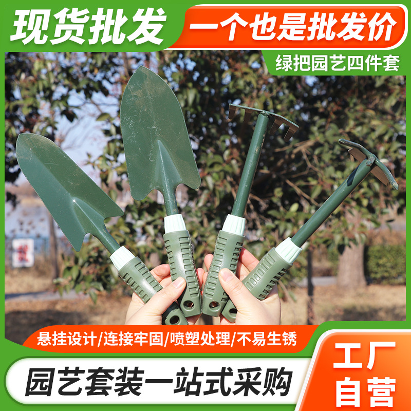 緑色の園芸用4点セット、鉢植え、花の植え付け、花の育成、小さなシャベル、屋外用土ほぐし、鉄製の熊手、海釣り道具、花用