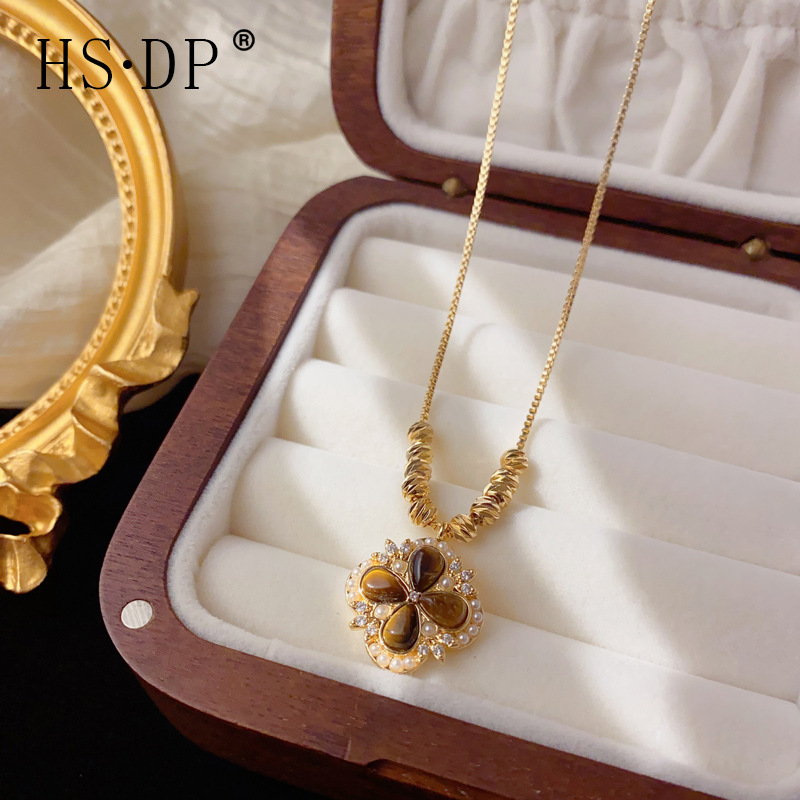 法式复古时尚轻奢百搭镶钻珍珠四叶花吊坠项链个性独特设计锁骨链