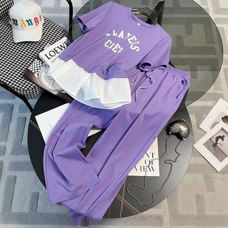 ファッションスポーツカジュアルスーツ女性夏服2024新型洋気収腰半袖偽二枚ワイドパンツ二枚セット