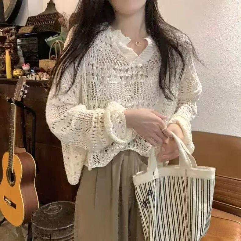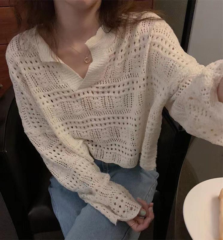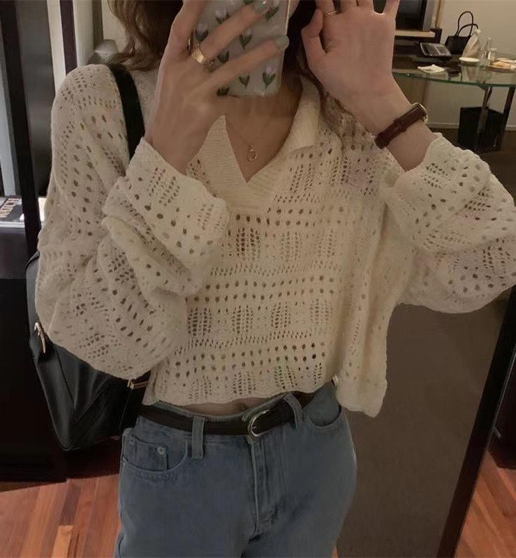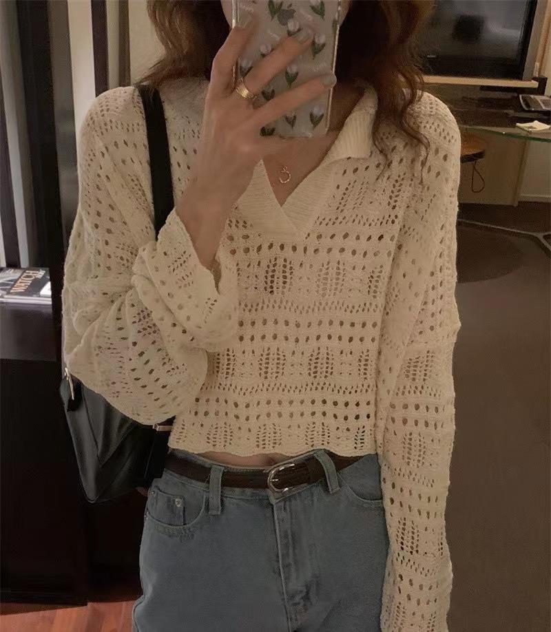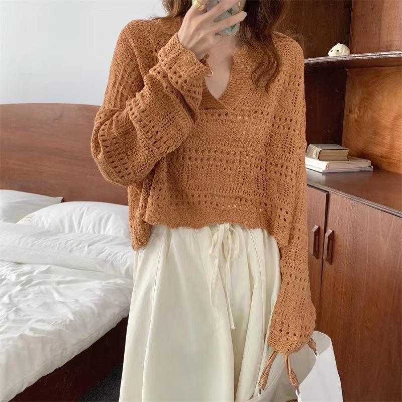 韓国の春と夏のフレンチレイジースタイルカラープルオーバー中空かぎ針編みルーズカジュアルショートニットセーター女性用