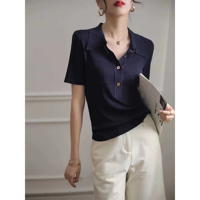 ラペル半袖シャツ女性のための 2025 新しい夏ネイビーブルースリム薄いアイスシルクセーターカラートップ