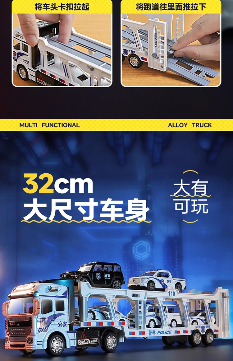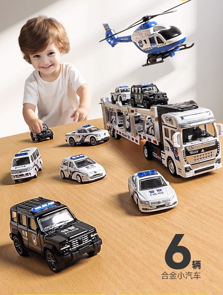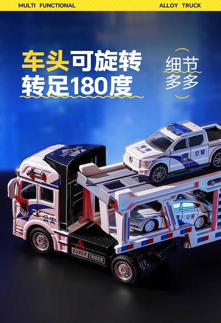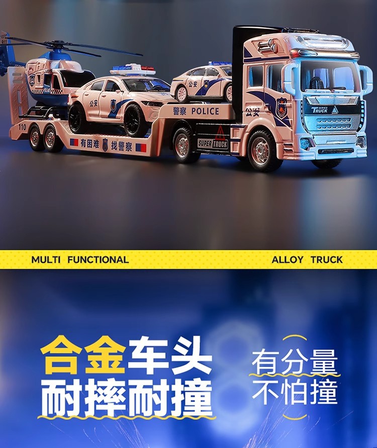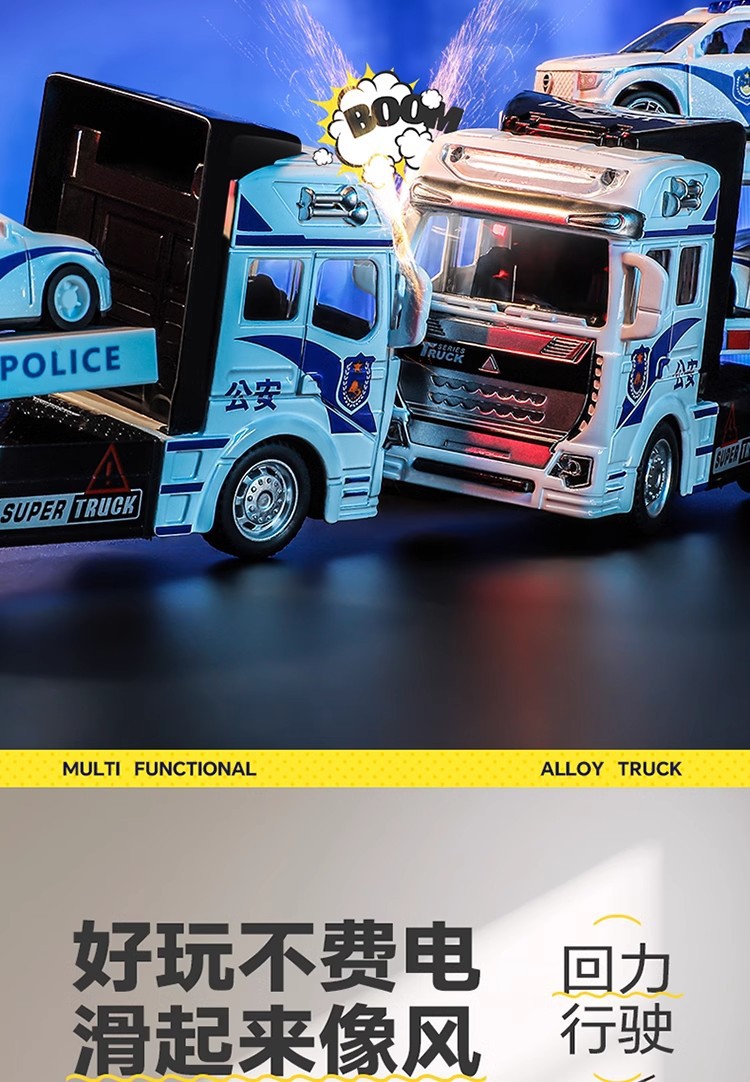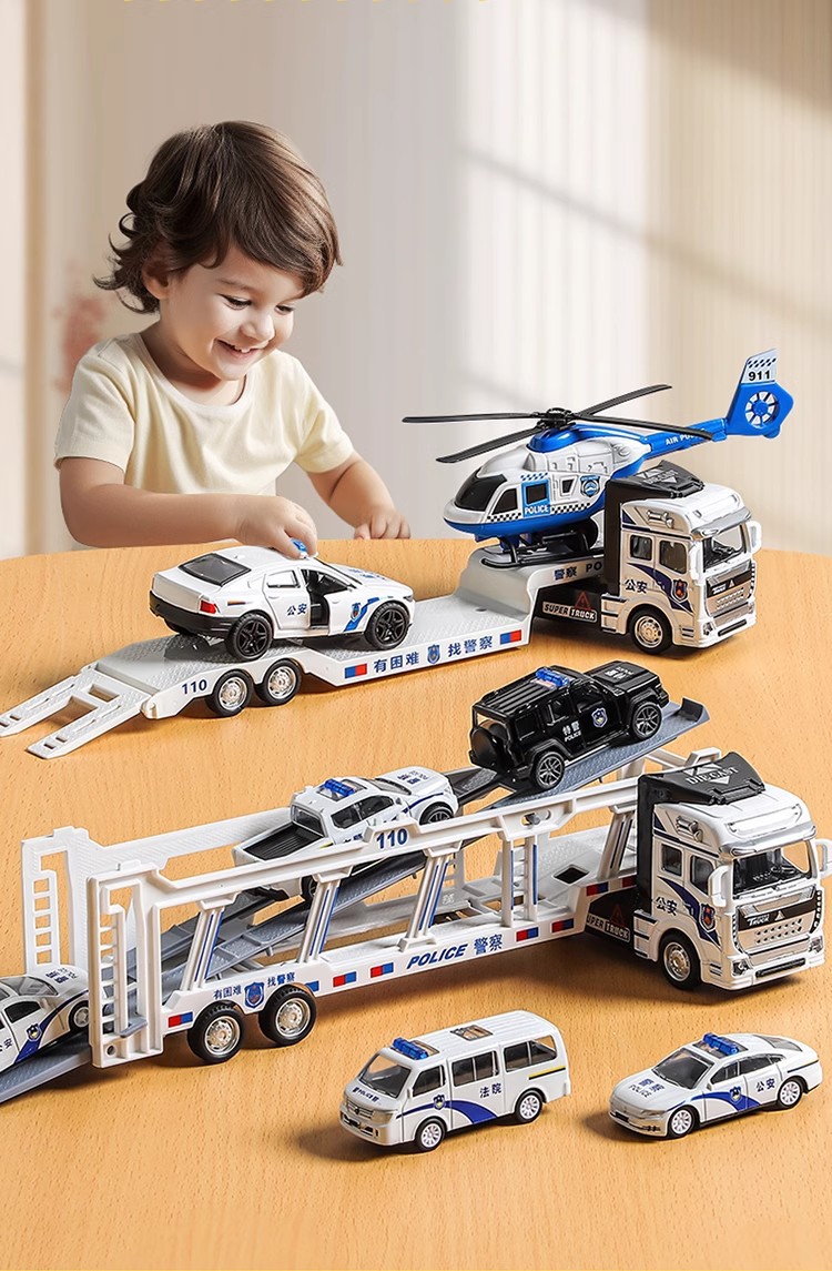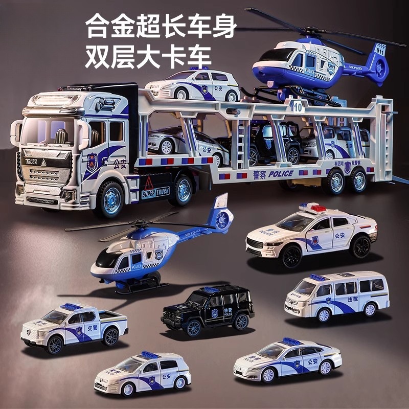 合金パトカー大型トラックトラック二重運搬車トレーラー子供玩具少年救助台車自動車モデル