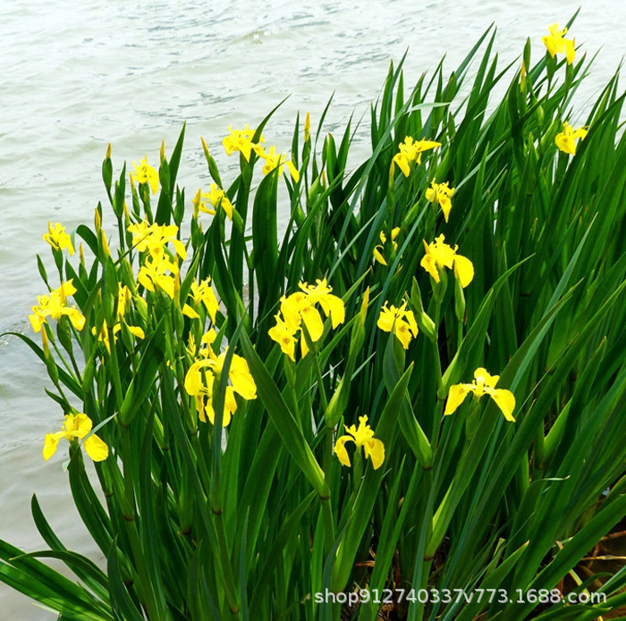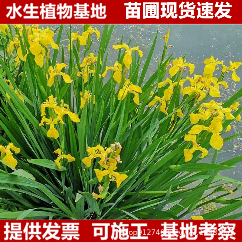黄菖蒲、黄色の花、水生アイリス、水生常緑アイリス、苗床卸売、人工湿地挺水植物