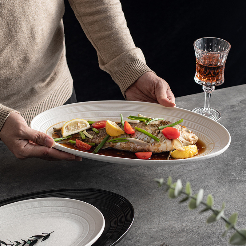 下絵色北欧スタイルホテル魚プレート家庭用蒸し魚プレート特大楕円形商業食器クリエイティブホテル磁器