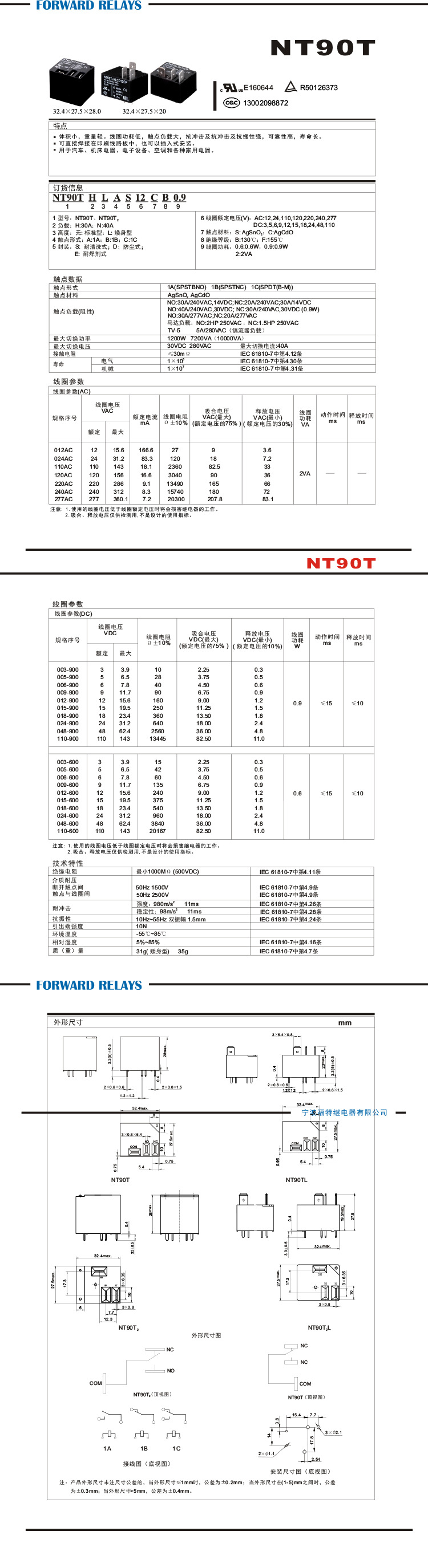 福特NT90TPNCE220CB空调继电器NT90TPNCE120CB/12V.24V.120V.40A