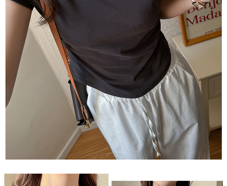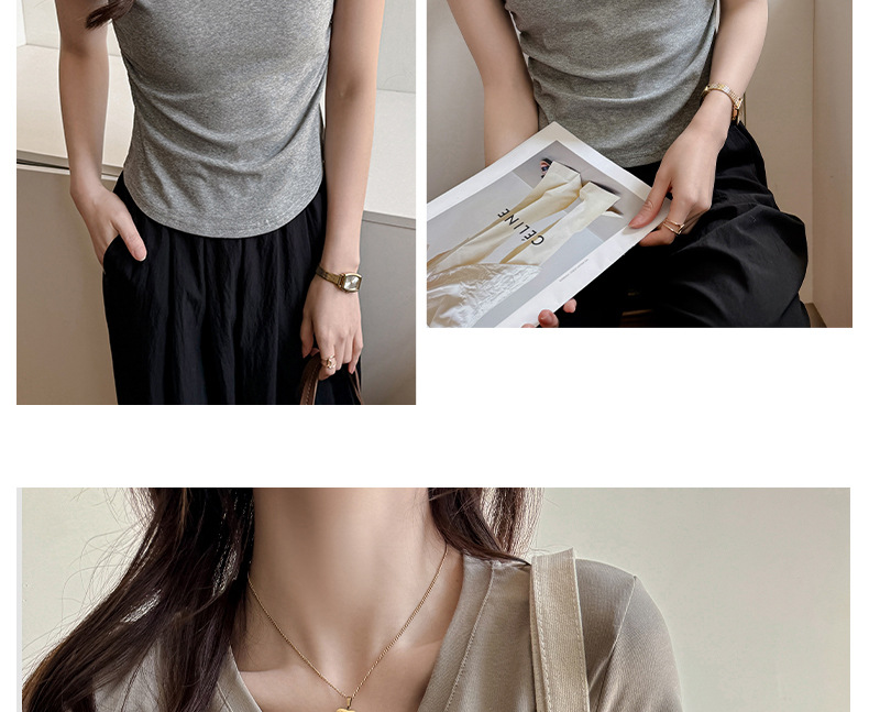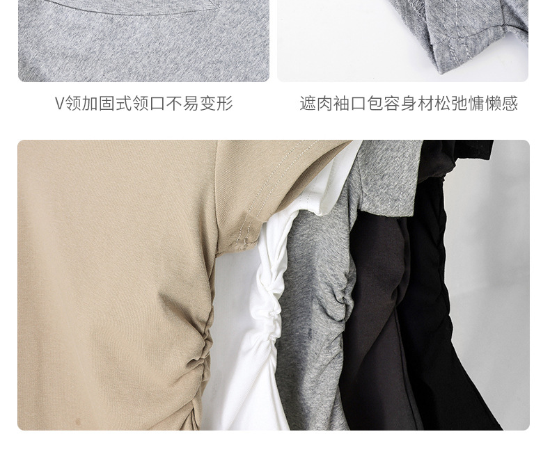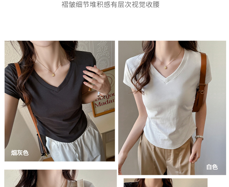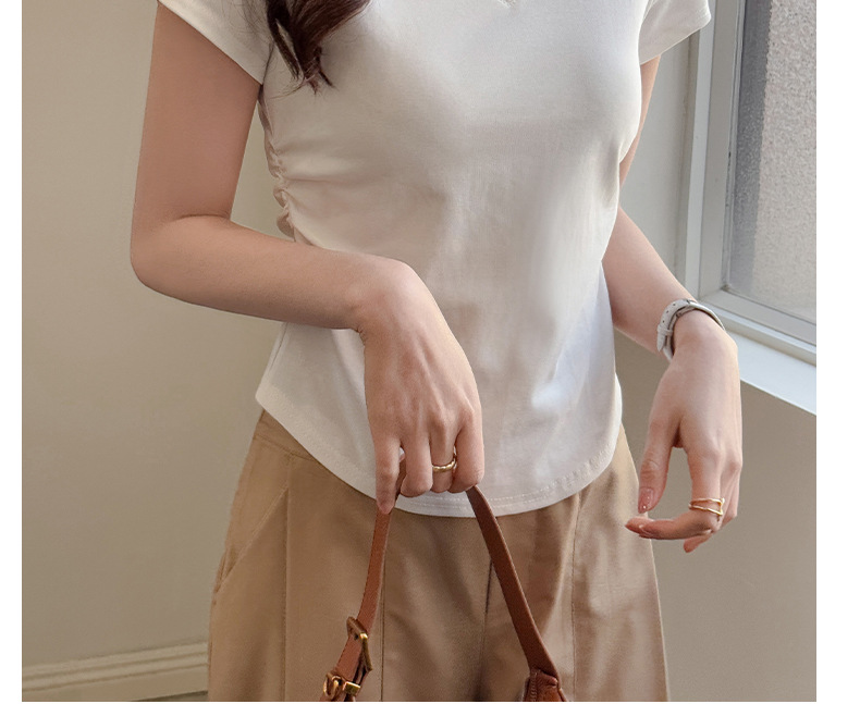 韓国系の小さい丸首の高級なデザイン感の正肩の半袖のtシャツの女性のサイドのしわの修身の底のシャツの夏の上着