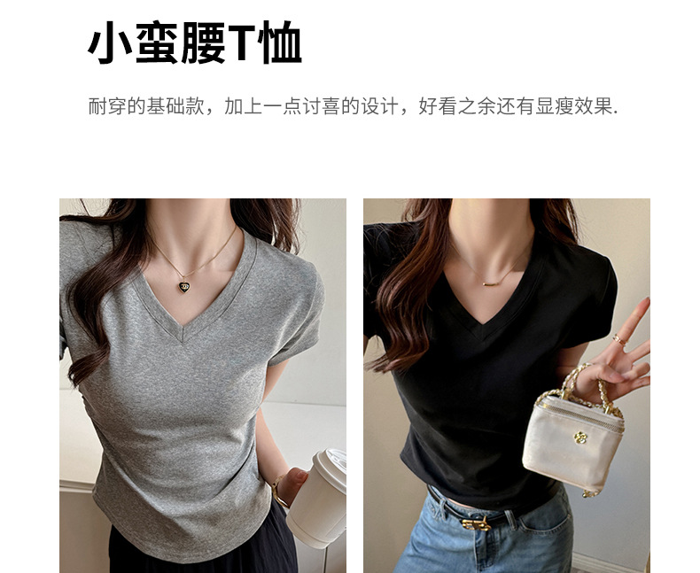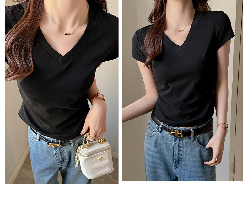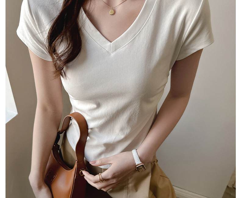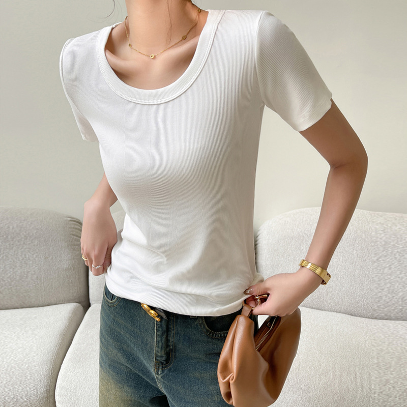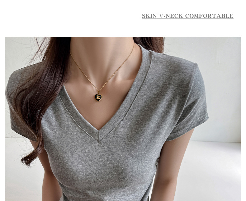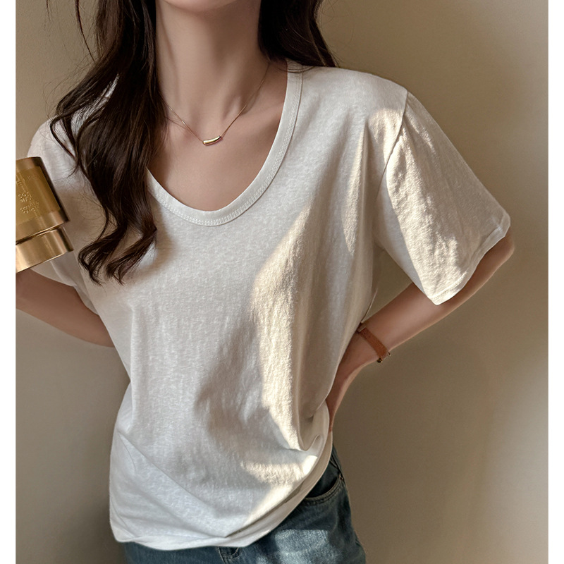 純欲風深U襟正肩半袖tシャツ女性式夏の修身はやせています。