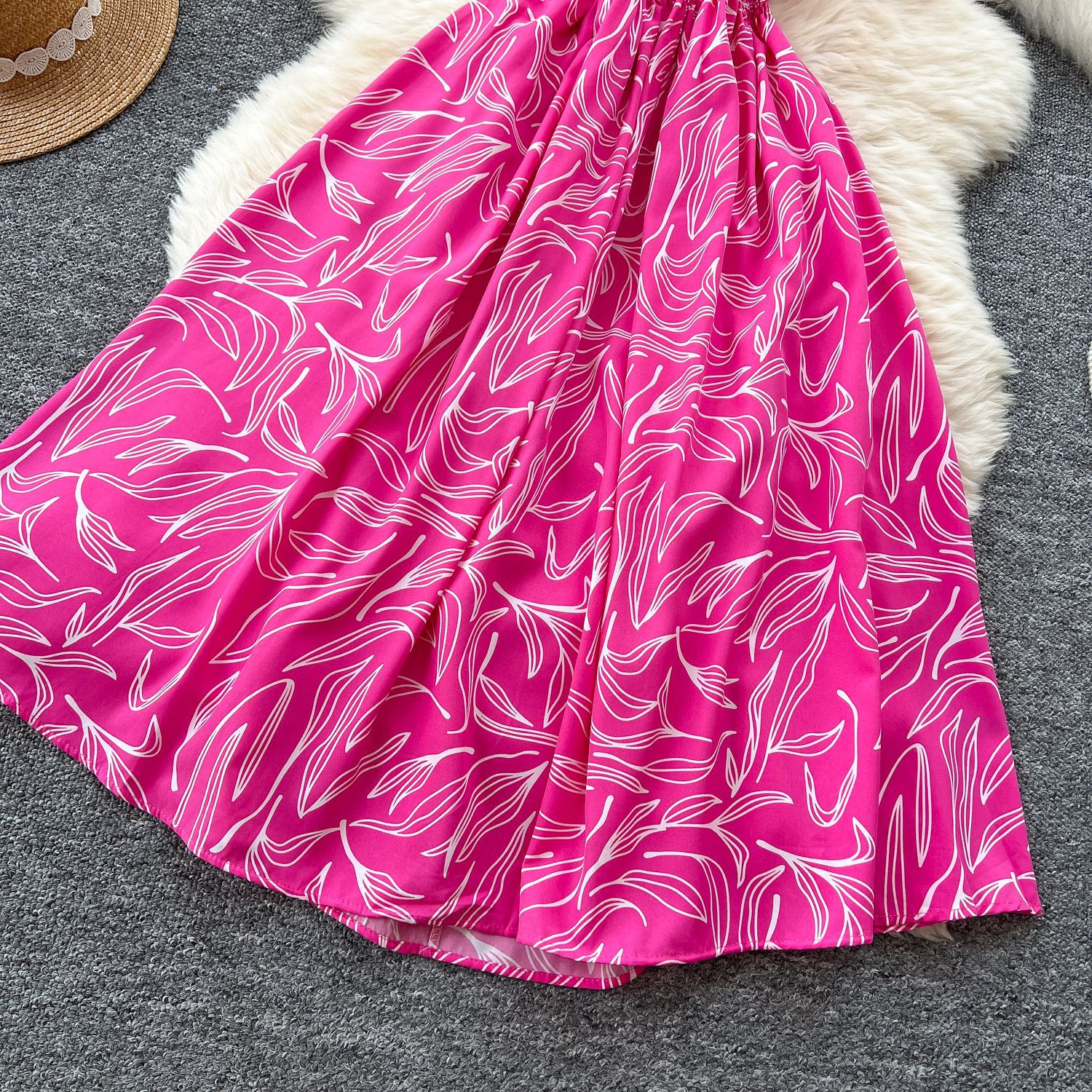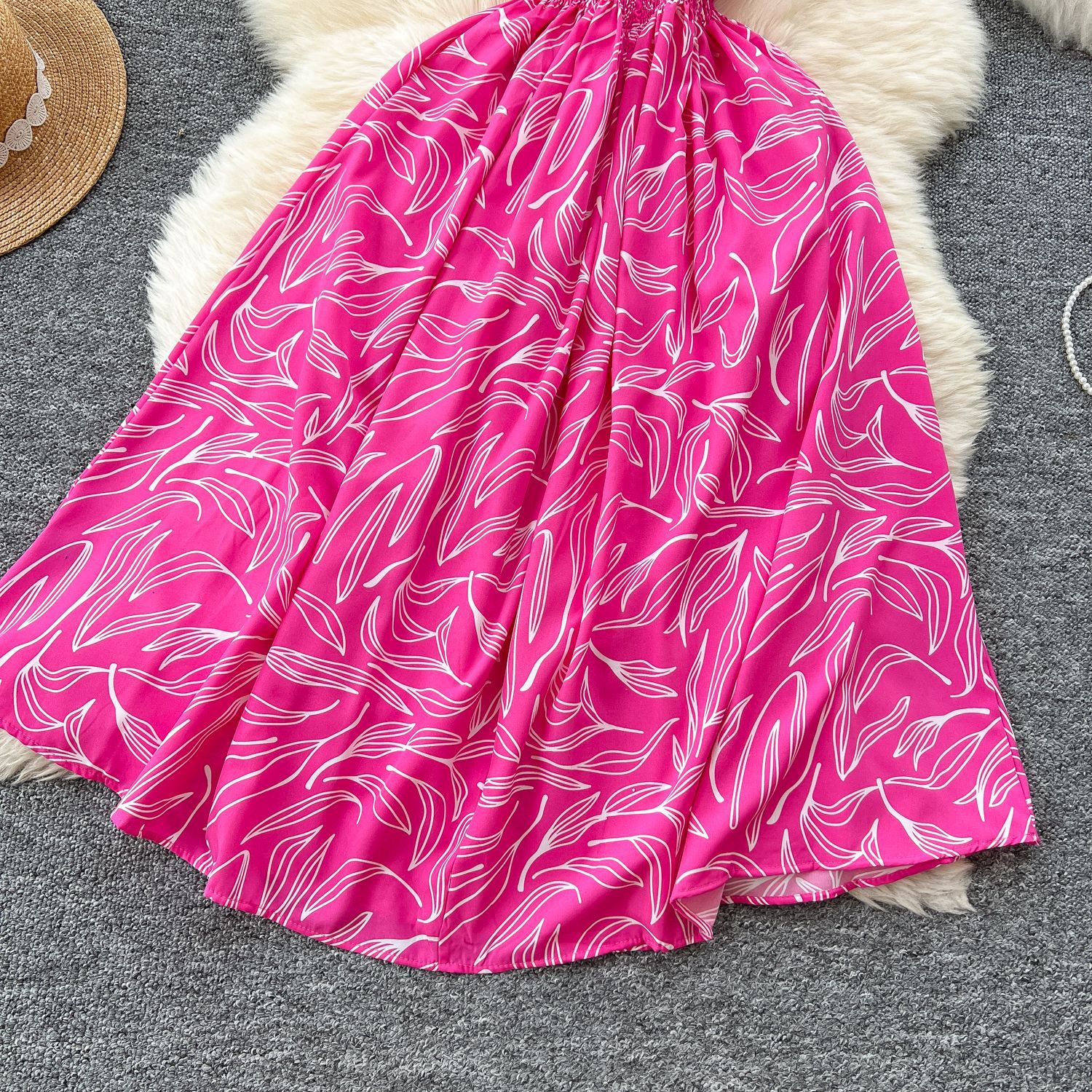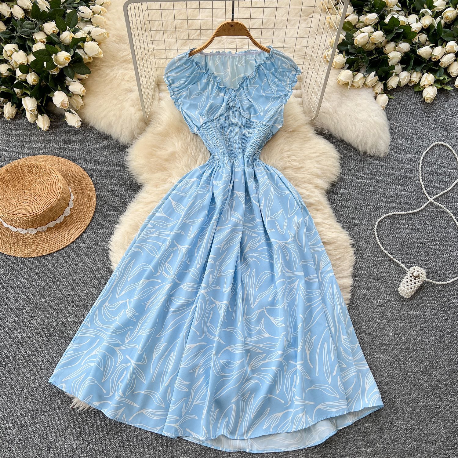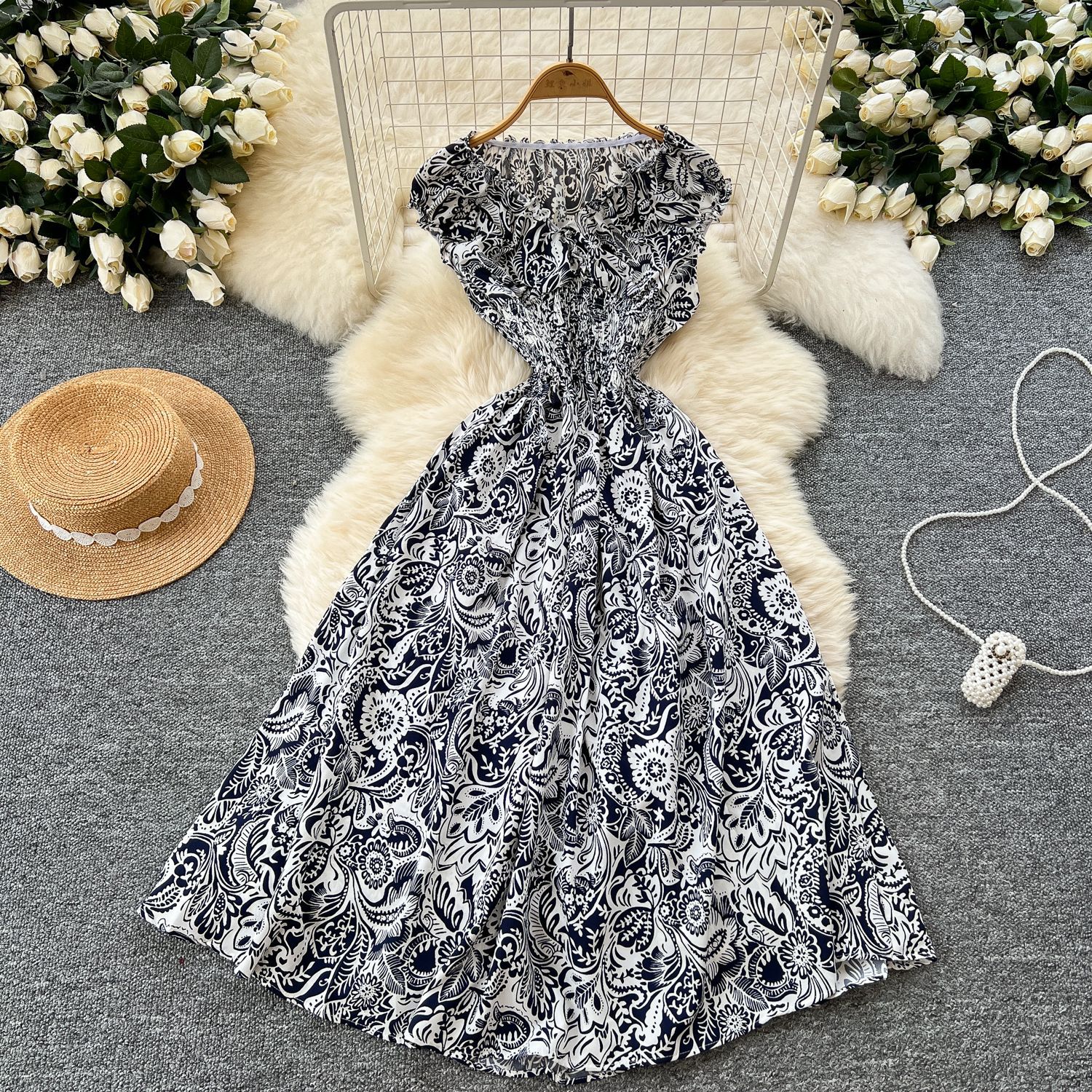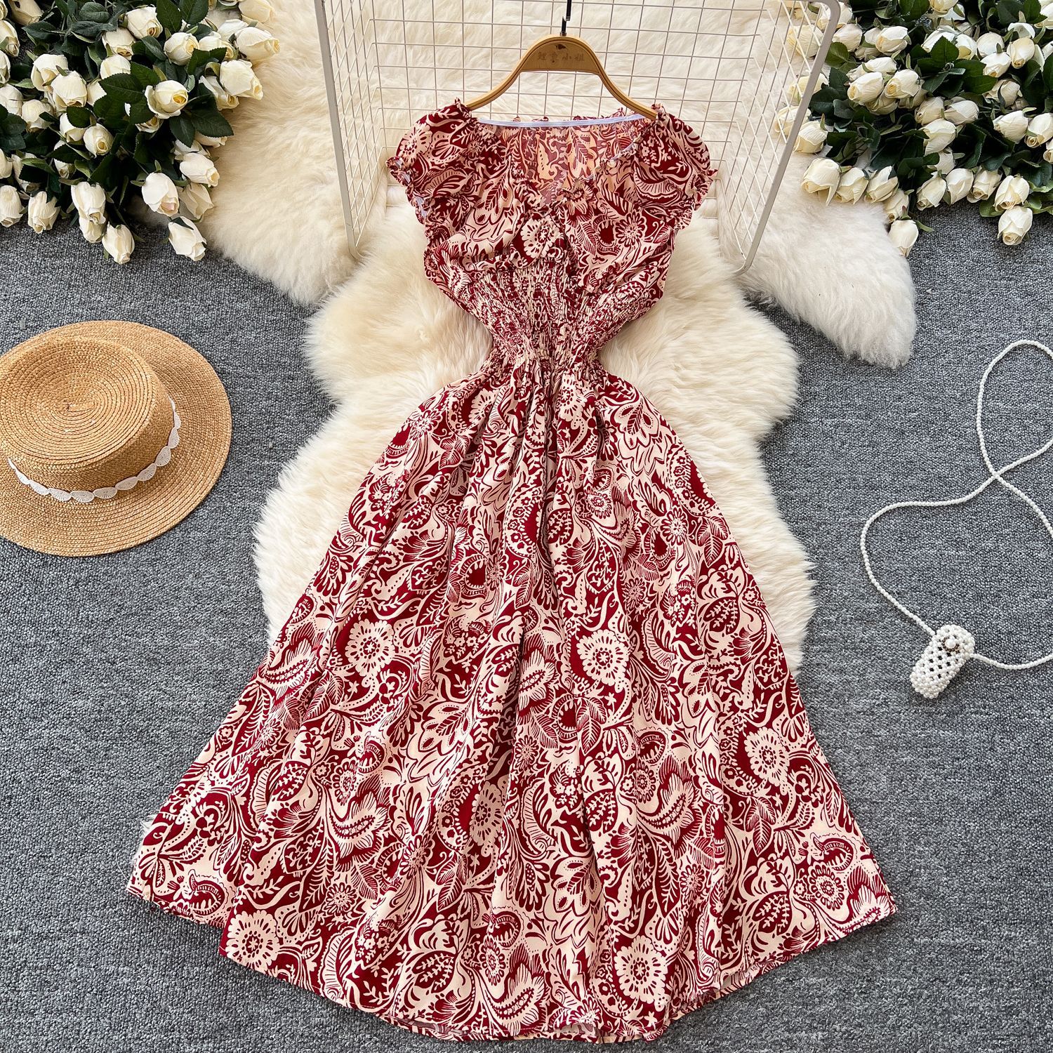 フレンチワンピース女性2025夏の新型ファッションウエストvネックの袖なしで痩せたプリントがレトロなロングスカートを飾っている