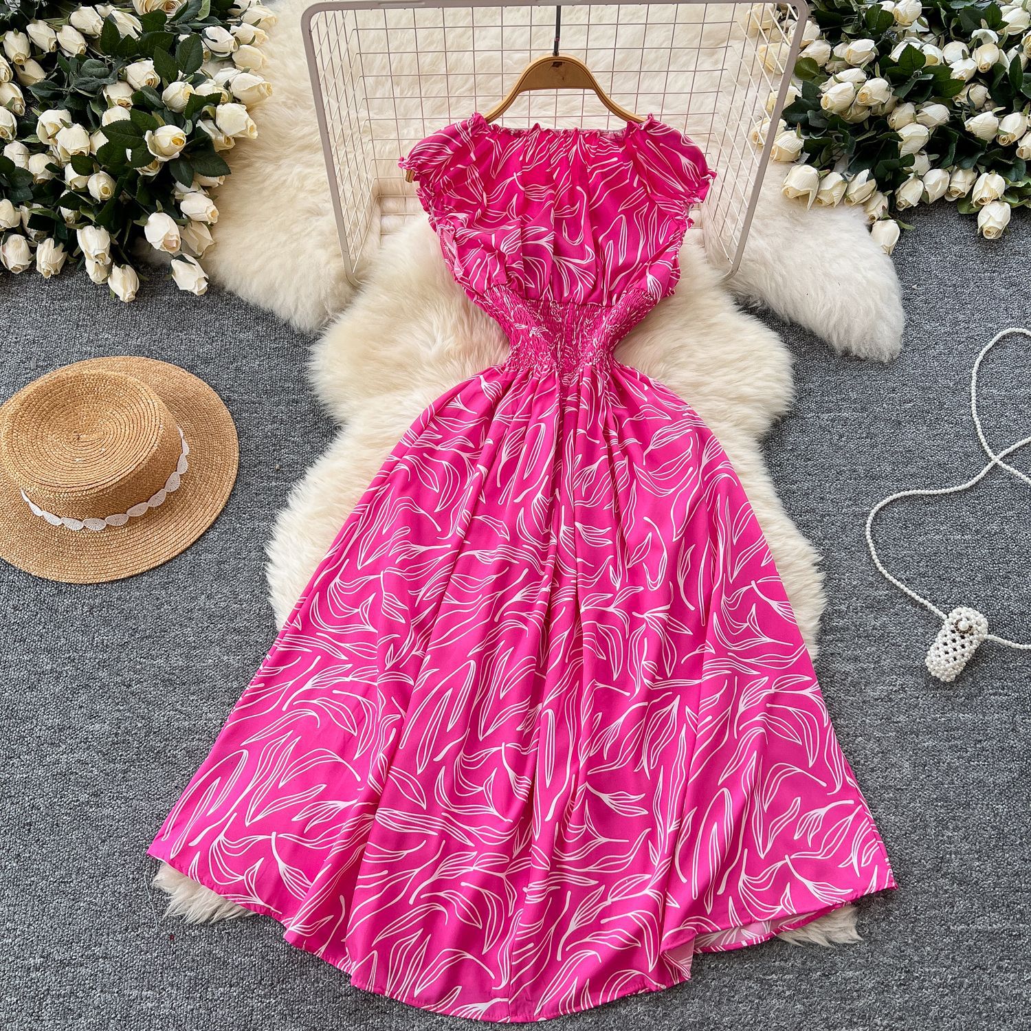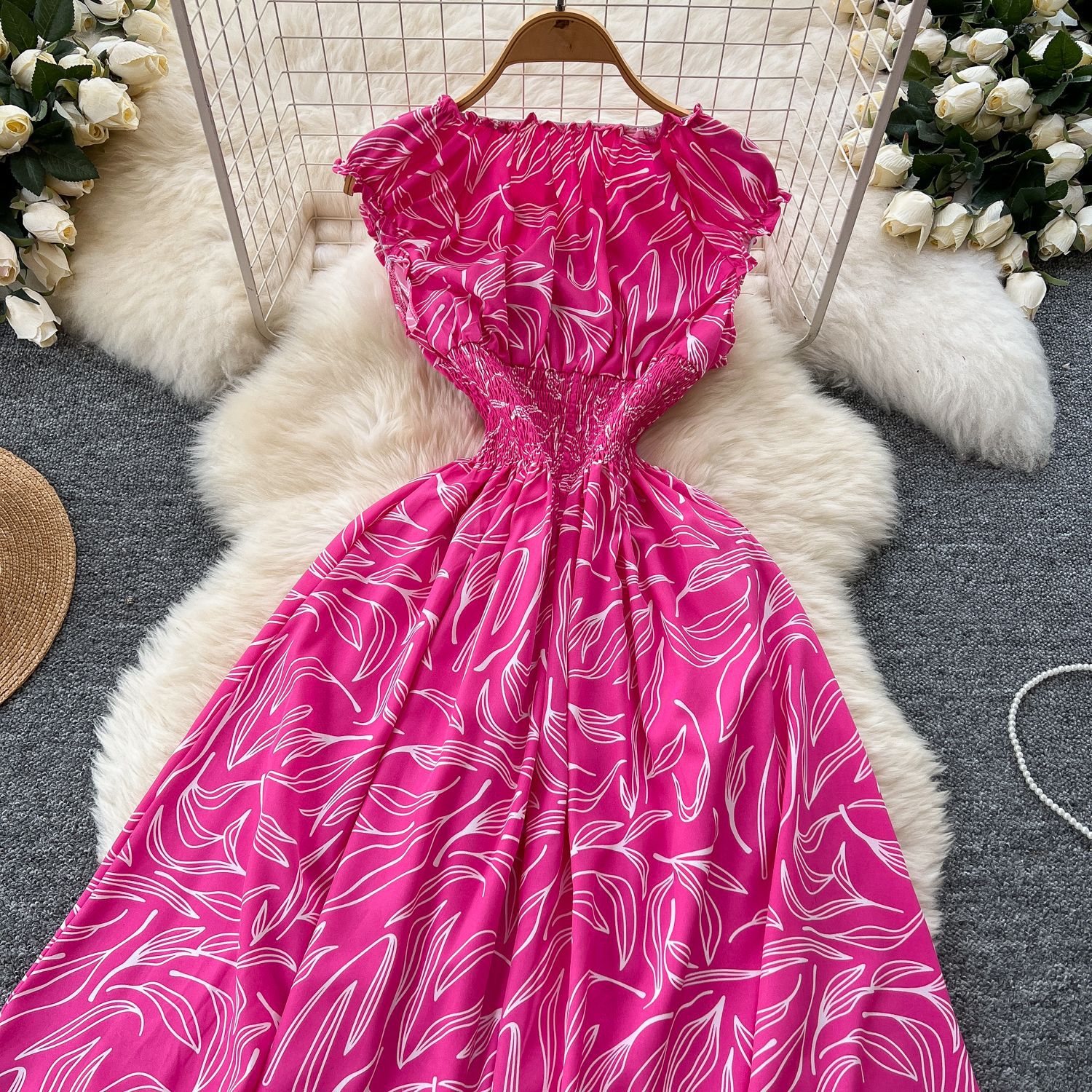 フランスの海辺のリゾートビーチのスカートの超仙の肩は肩を現して腰を収めてやせているa字のケーキの花のワンピースの夏を現します。