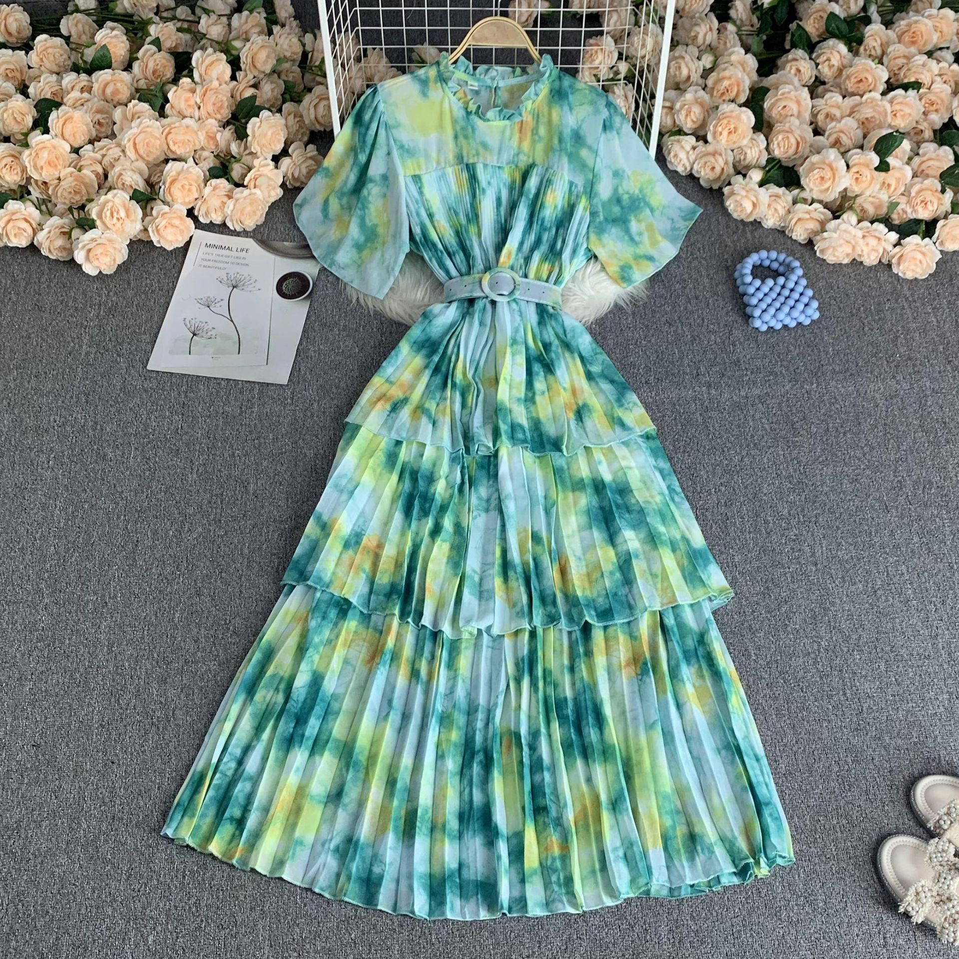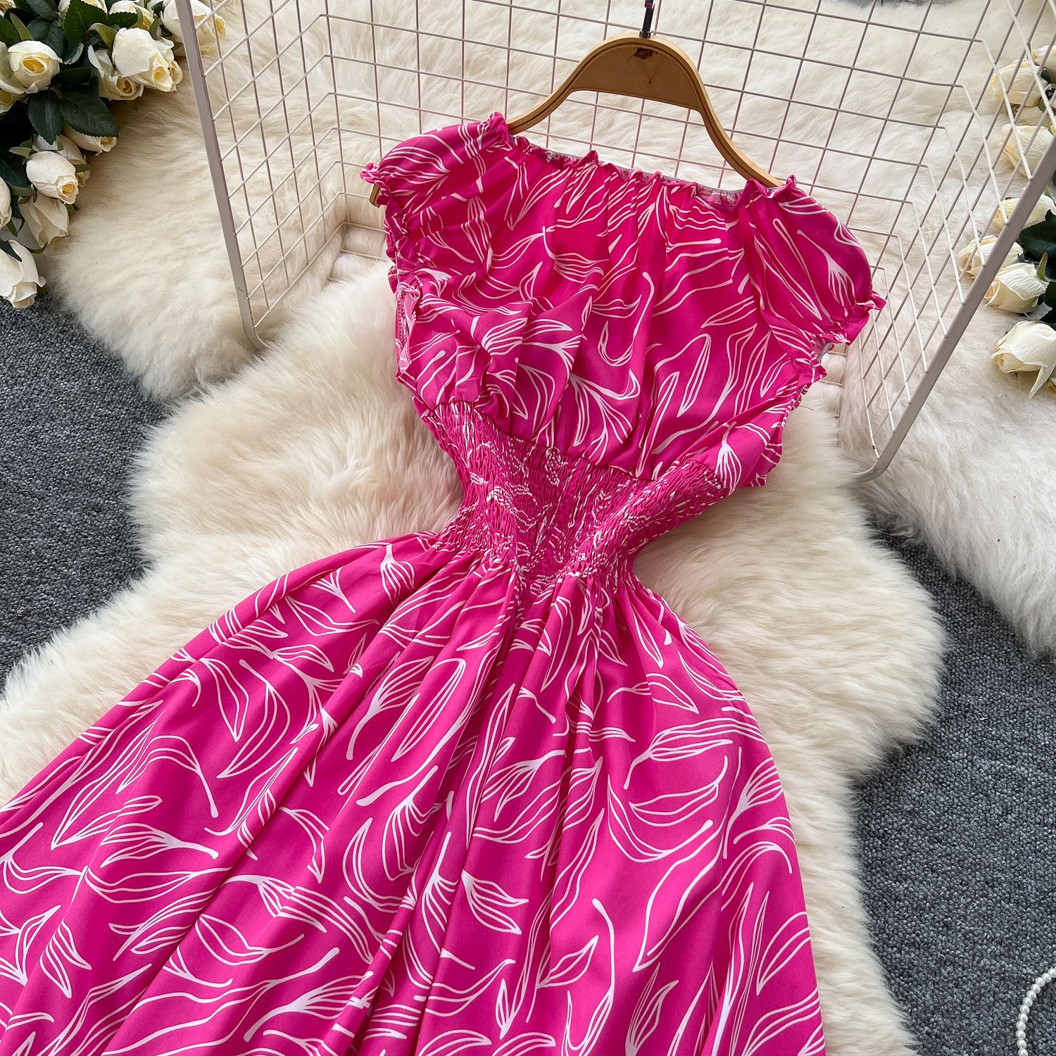 フレンチスタイルのVネックワンピース、半袖、夏に大人気、ウエストを絞る紐付き、ビーチドレス、膝丈、大きな裾のロングドレス、甘くて爽やかです。