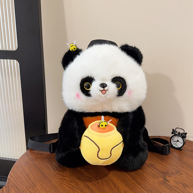 森系卡通蜂蜜罐罐熊猫毛绒双肩包可爱软萌仿真熊猫玩偶包儿童背包