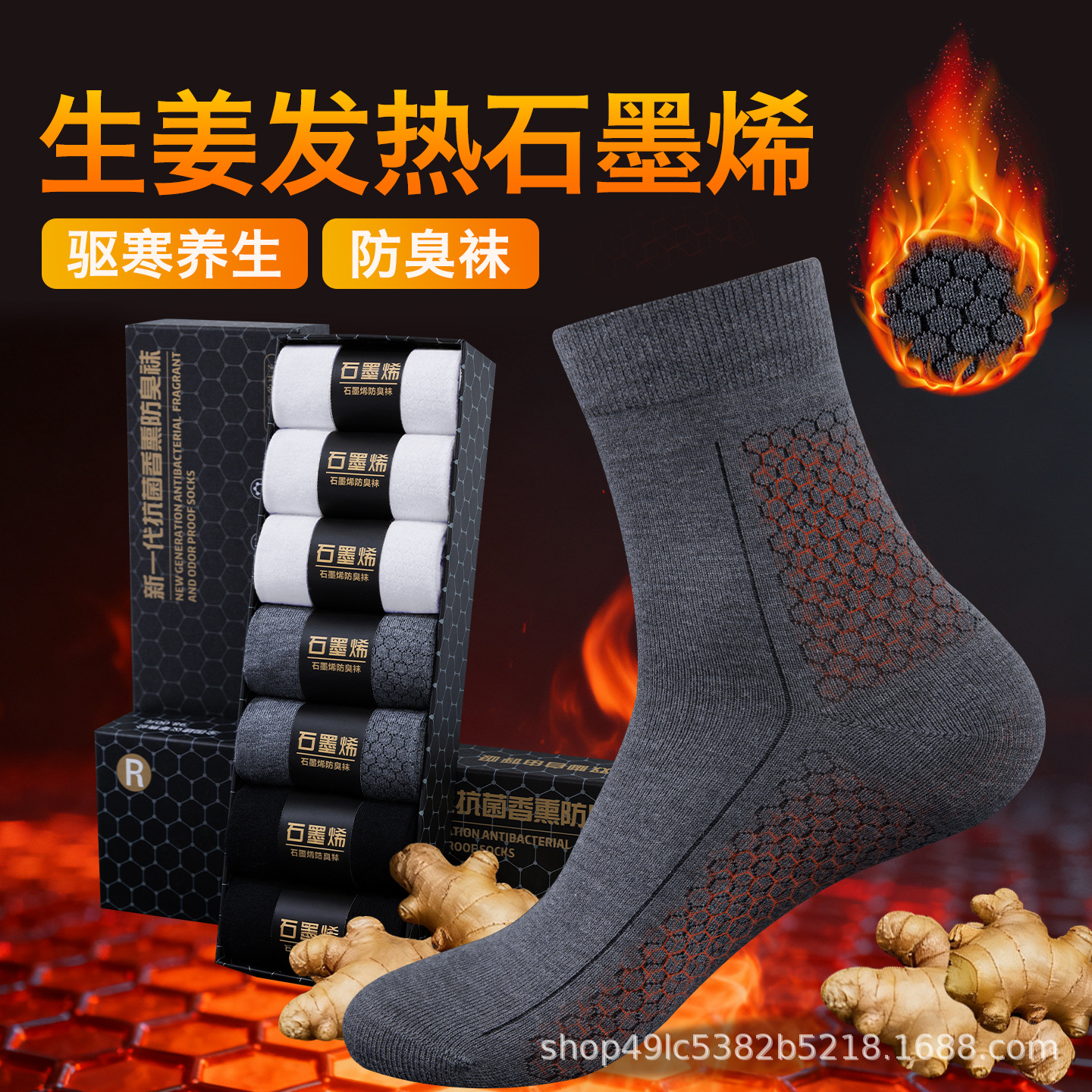 生姜石墨烯男士中筒袜子秋冬纯色新疆棉加热保暖运动吸汗商务长袜
